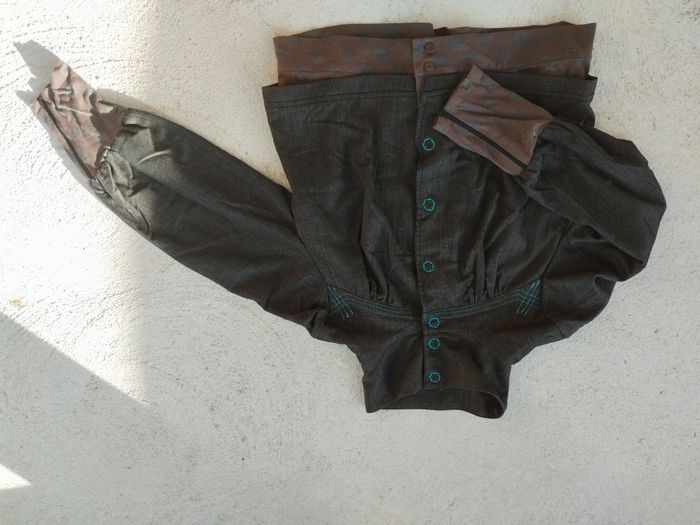 🖤 Veste, blazer, tailleur 🖤 Manches : longues 🖤 Couleur : plusieurs tons de marron 🖤 Surpiqures : bleues 🖤 Boutons : gros boutons pression agrémentés de fil turquoise 🖤 Caractéristiques : Doublée par un tissu jersey que l’on retrouve au bout des manches 🖤 Matières : Coton - Polyester - Viscose et Spandex 🖤 Longueur : 61 cm 🖤 Largeur : 52 cm 🖤Marque : GF Woman - Oliblo