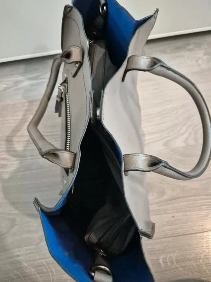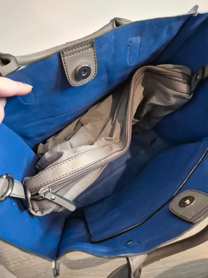 Sac cabas gris clair, avec un pochette à fermeture éclair à l intérieur que l'on peut enlever, très pratique, ➡️ Longueur anse 19 cm ➡️ Dimension 42 cm x 30 cm x 14 cm ⭐un petit défaut sur l anse , quelques marques par endroit mais il reste en très bon état ✈Envoi rapide des colis 💗 Abonnez vous à mon profil, nombreux articles ajoutés régulièrement ! 🌸 Tapez Laetitresors pour voir mes annonces #laetitresors_sac #sac #main #mineli #gris #cabas #pochette #interieur #gris #bleu #grand #souple #laetitresors