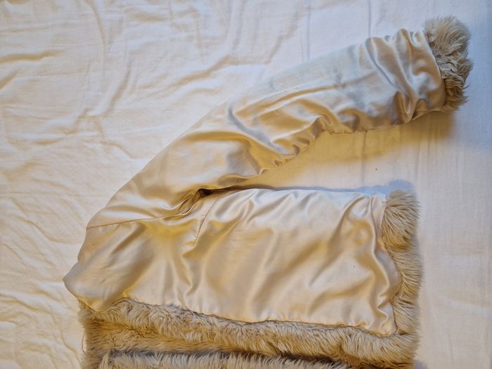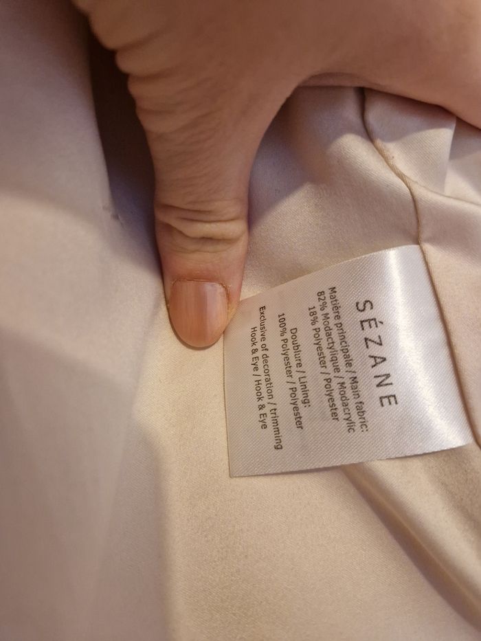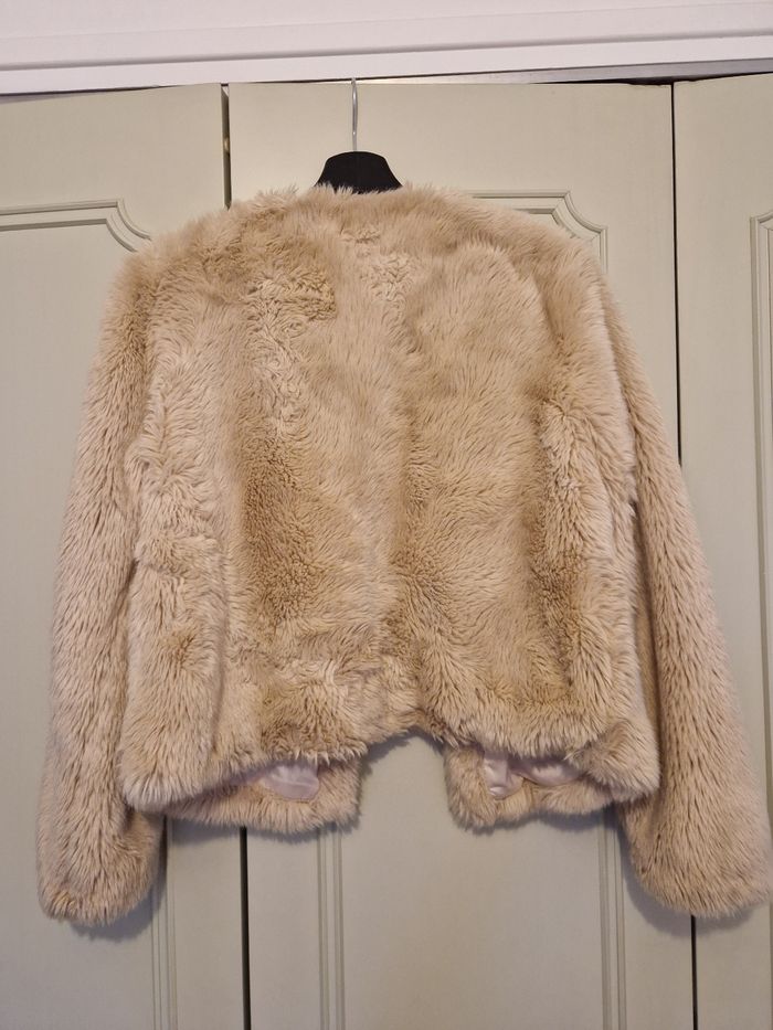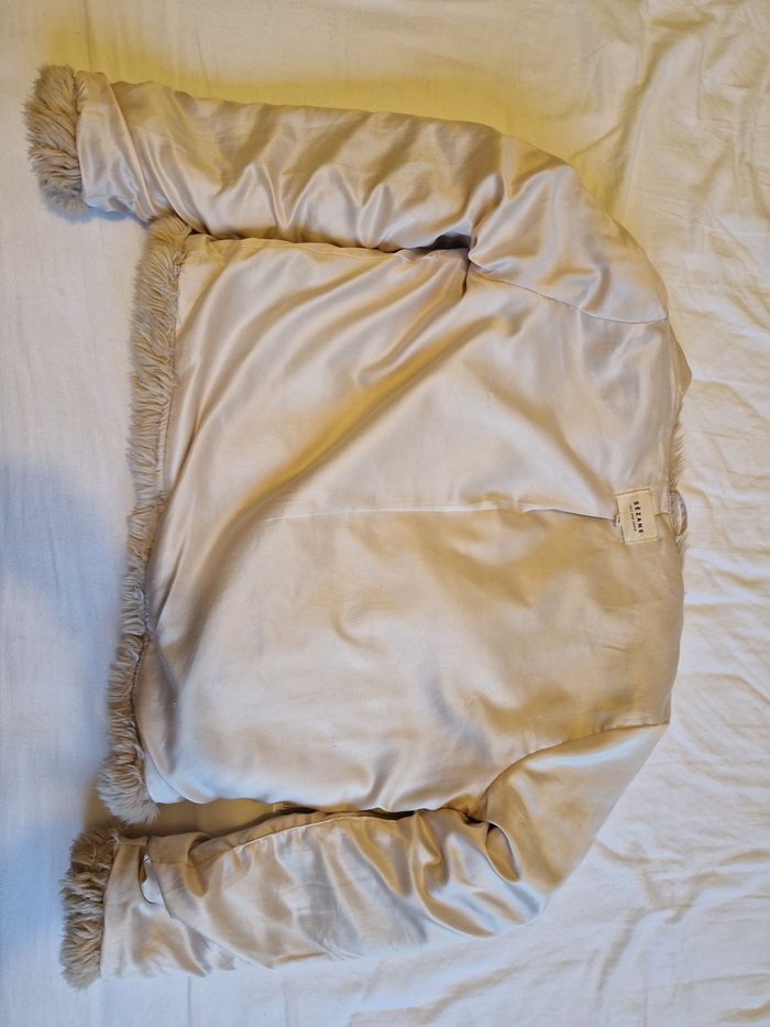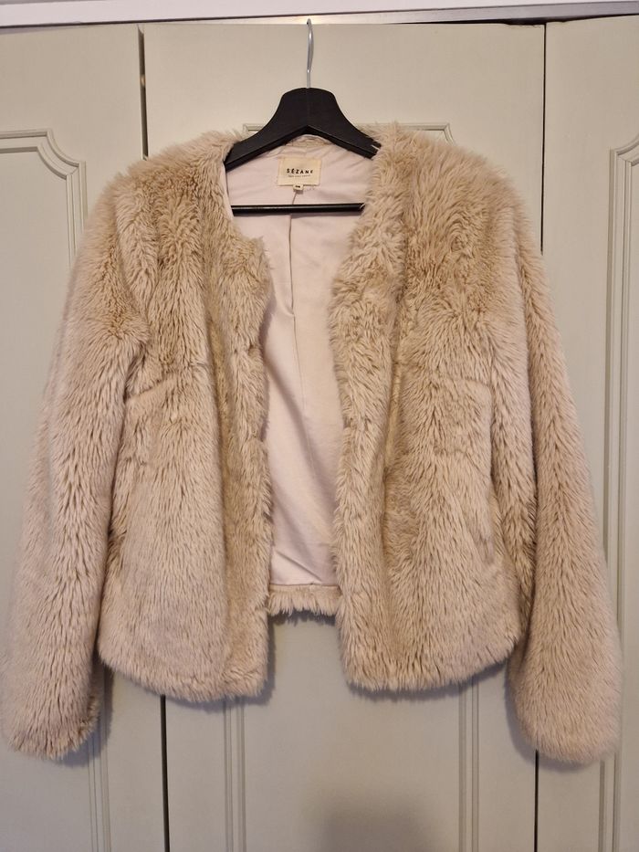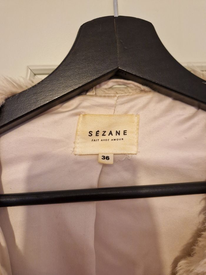 Fausse fourrure Sézane en taille 36. Il y a des marques d'usure sur la doublure (voir photo). Très douce et bien chaude.