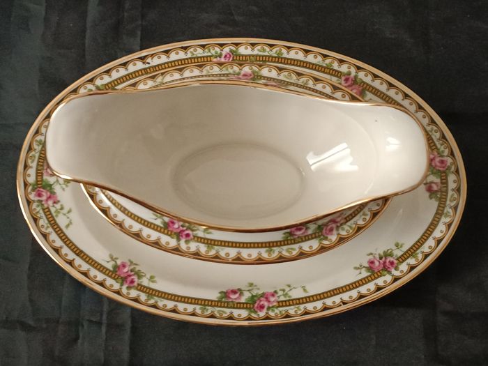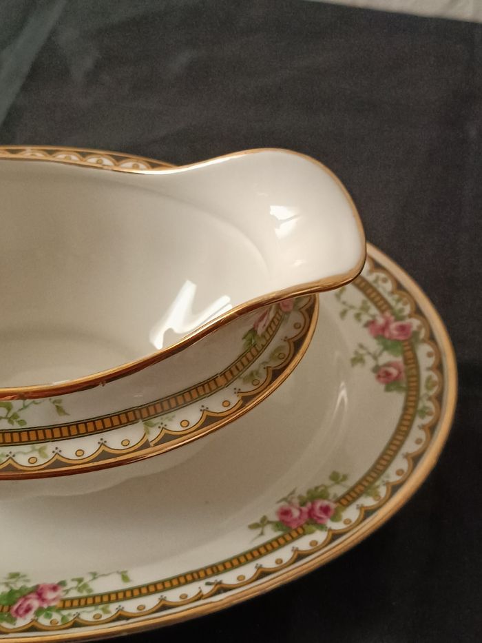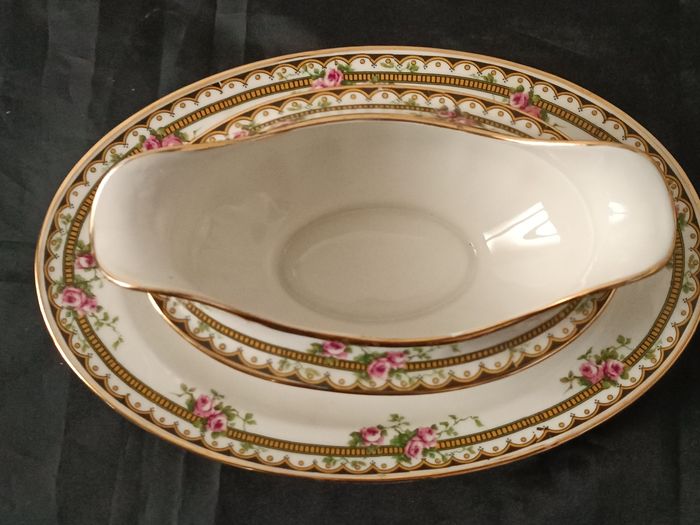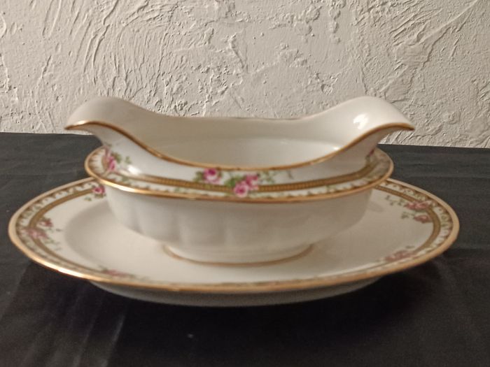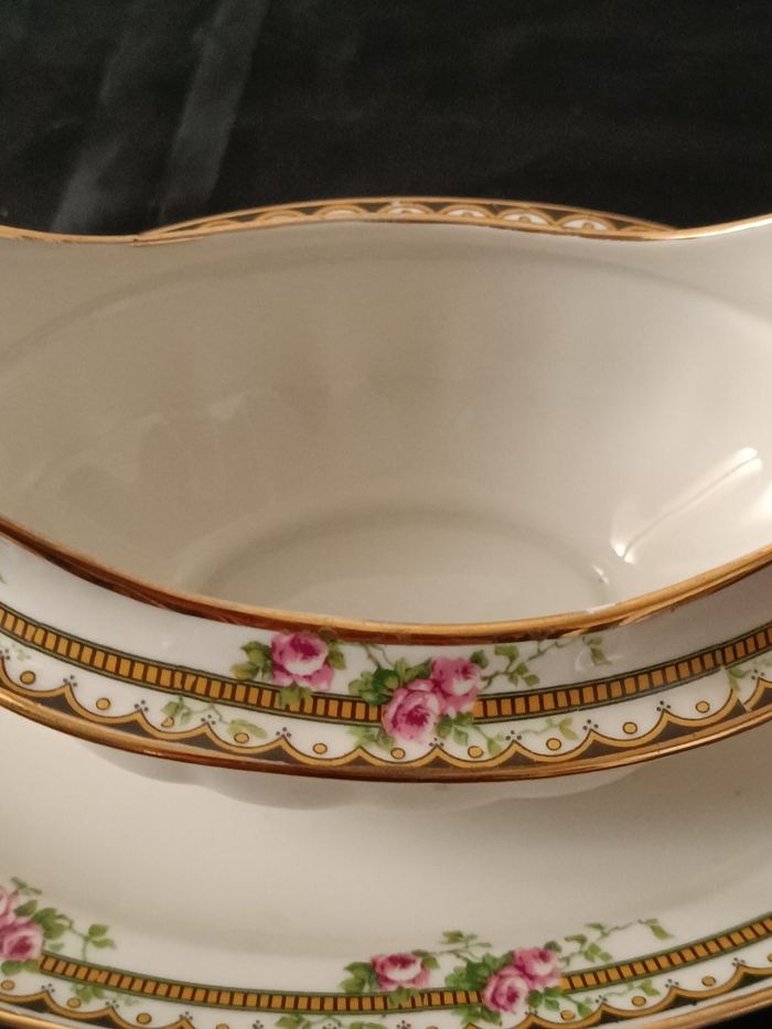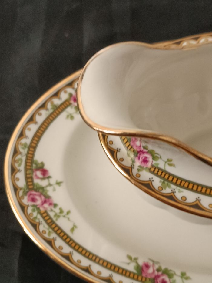 Saucière en porcelaine Jean Boyer Limoges France 25 cm x 16 cm x 7 cm en état cf photos décor floral et liseret doré