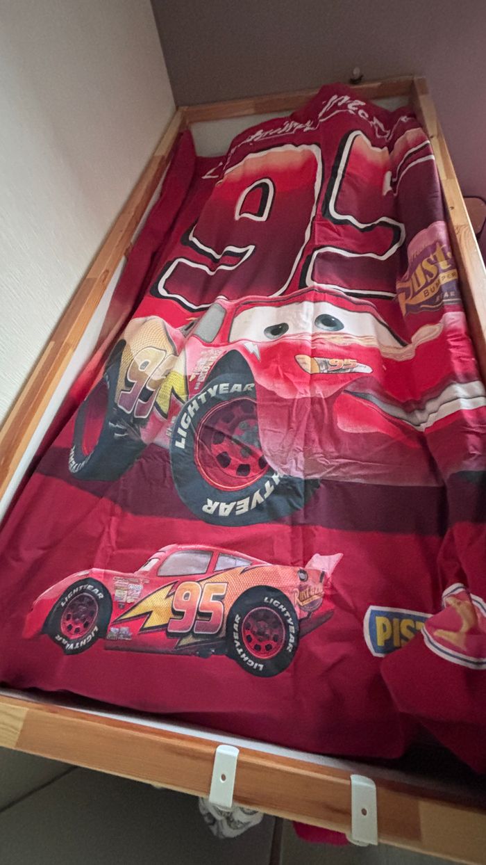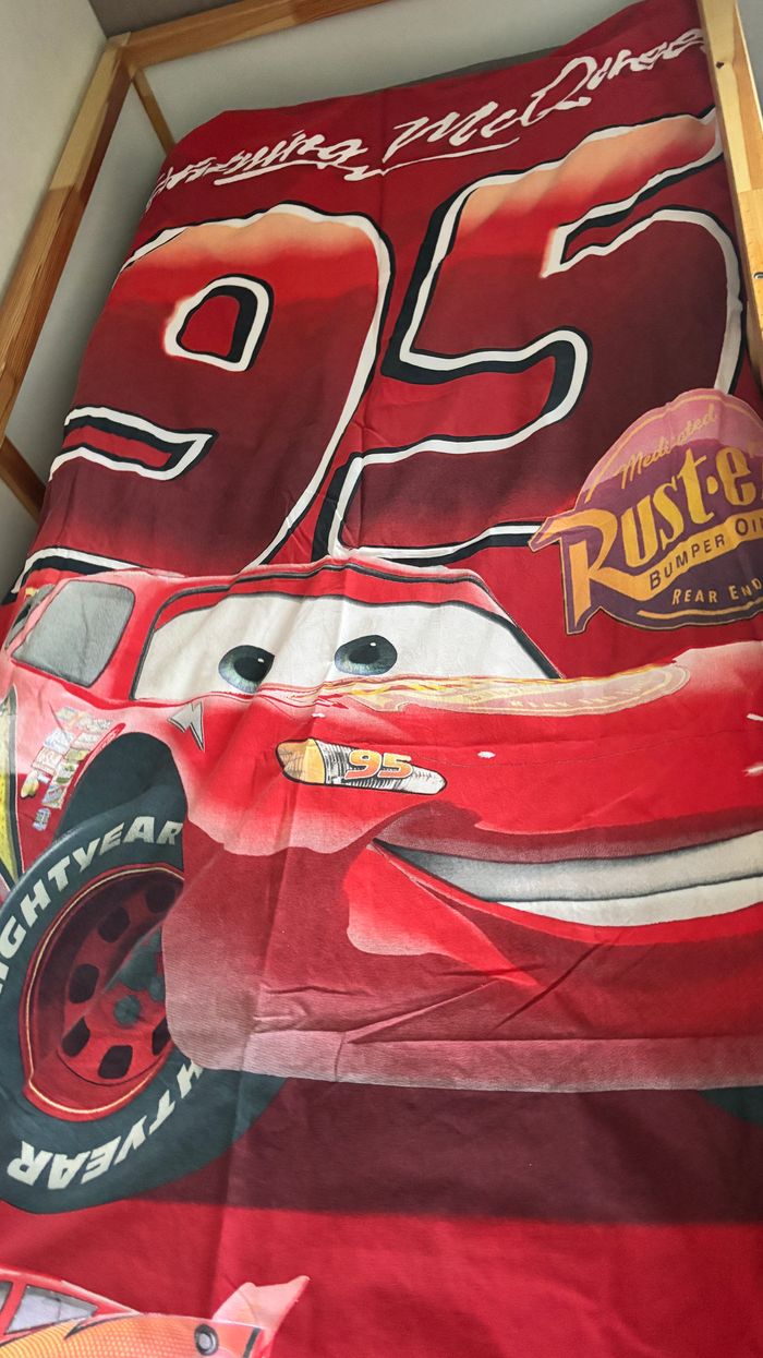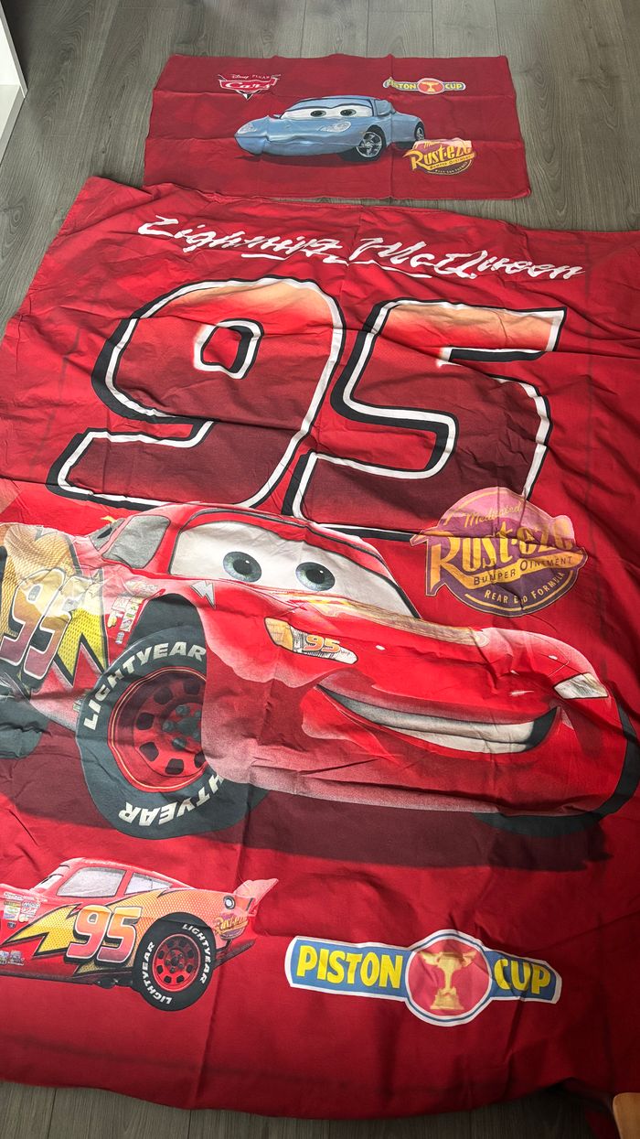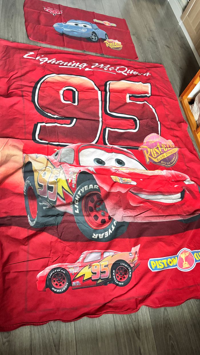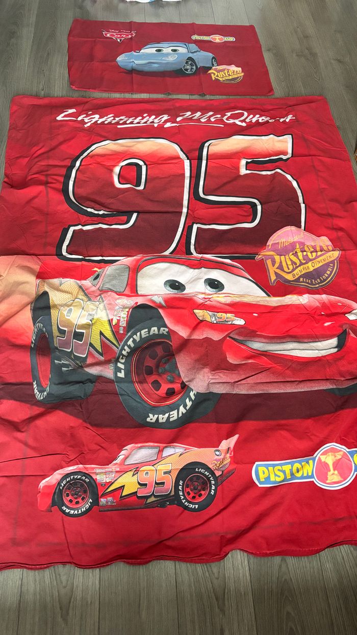Parure de lit Cars Disney Pixar Micasa Housse de couette 140x190cm Housse de coussin 60x100cm utilisé en bon état avec imperfection uniquement sur les coins Voir TOUTES les photos