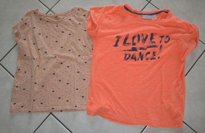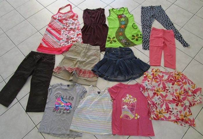 Lot de 14 vêtements fille 10 ans 3 jolies robes été 5 tee-shirts (2 autres sur la photo 2) 1 legging rose mi-long 1 legging long marine à fleurs 1 pantacourt marron à poches 1 jupe chaude beige 1 jupe en jean 1 haut léger à manches longues snowboard.