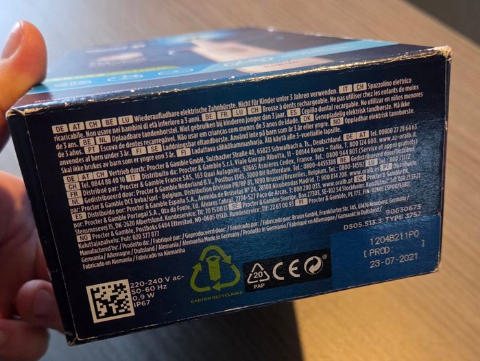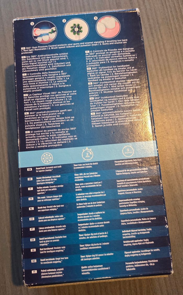 Brosse à dents électrique ORAL B pro 3 neuve 3000 Braun La brosse à dents électrique Oral-B Pro 3 vous aide à vous brosser les dents comme le recommande votre dentiste. La minuterie vous aide à brosser vos dents pendant 2 minutes et vous avertit toutes les 30 secondes de changer de zone de brossage. La tête de brosse ronde élimine jusqu'à 100 % de plaque en plus qu'une brosse à dents manuelle classique et permet d'avoir des gencives plus saines. Nettoyage en profondeur Technologie 3D et contrôle visuel de la pression à 360°. 3 modes de nettoyage : quotidien, éclaircissant et sensible. Batterie lithium-ion, minuteur de 2 minutes. La tête ronde de la brosse à dents Oral-B contourne chaque dent et aide à avoir des dents plus propres et des gencives plus saines, tout en éliminant jusqu'à 100% de plaque en plus qu'une brosse à dents manuelle. Des dents plus blanches dès le premier jour La PRO 3 dispose d'un mode spécial de nettoyage éclaircissant en plus des modes "Nettoyage quotidien" et "Sensible". contrôle de pression des gencives à 360° Cette fonction protège vos gencives en vous indiquant si vous vous brossez trop fort. Le capteur de pression à 360° passe au rouge et ralentit automatiquement la vitesse de brossage. Minuterie intégrée La minuterie intégrée vous informe lorsque vous avez terminé les deux minutes de brossage recommandées par votre dentiste. Durée de vie de la batterie Batterie rechargeable longue durée. La station de charge est si petite qu'elle peut être placée sur une table de salle de bain ou un lavabo. Têtes de brosse conçues avec des dentistes Oral-B PRO 3 et têtes de brosse sont conçues pour se compléter de manière optimale