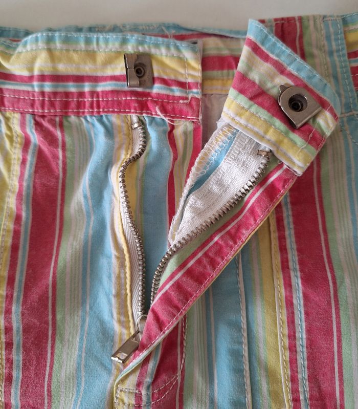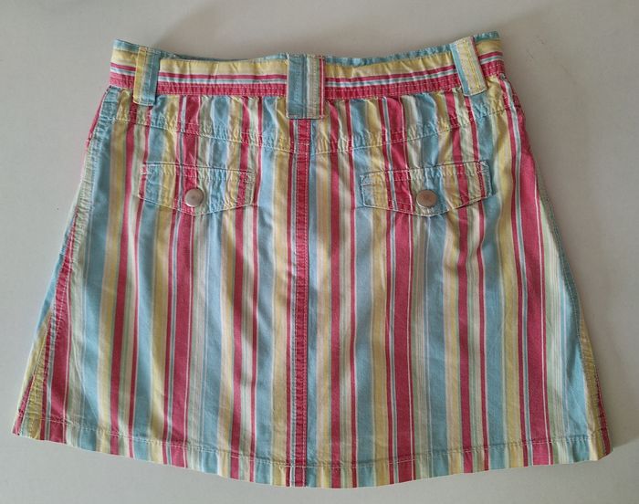 Jupe multicolore à rayures fermée par une agrafe et une fermeture éclair. ll y a un élastique de resserrage à l'intérieur. Il y a des poches devant et derrière avec des boutons pression. Elle est en 100 % coton.