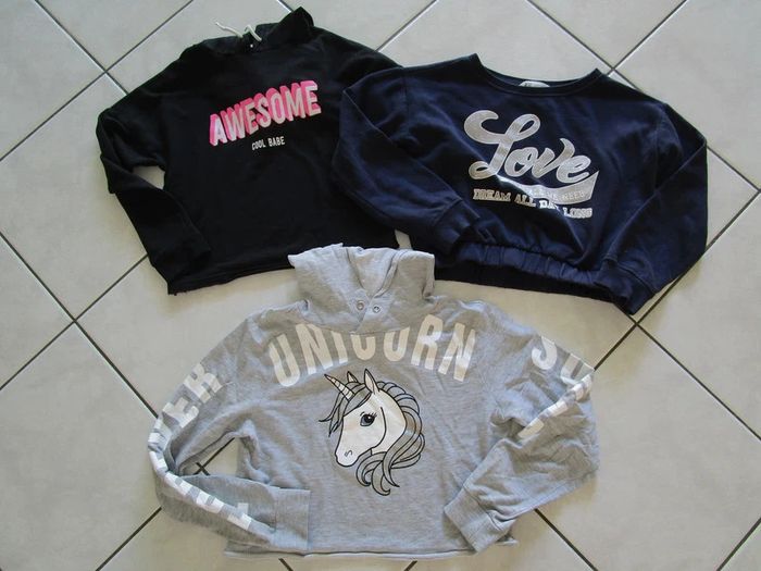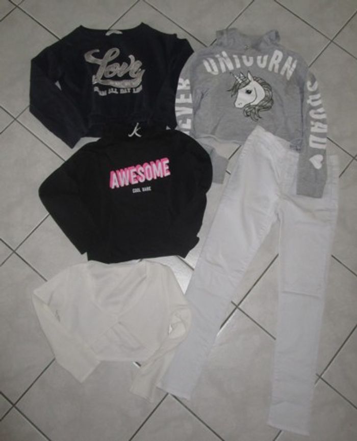3 sweats: - Bleu marine H&M inscriptions paillettes - Gris clair capuche H&M inscription licorne - Noir capuche GEMO inscription Awesome 1 jean blanc Denim&co 1 gilet bolero blanc crème. Tout est en excellent état.