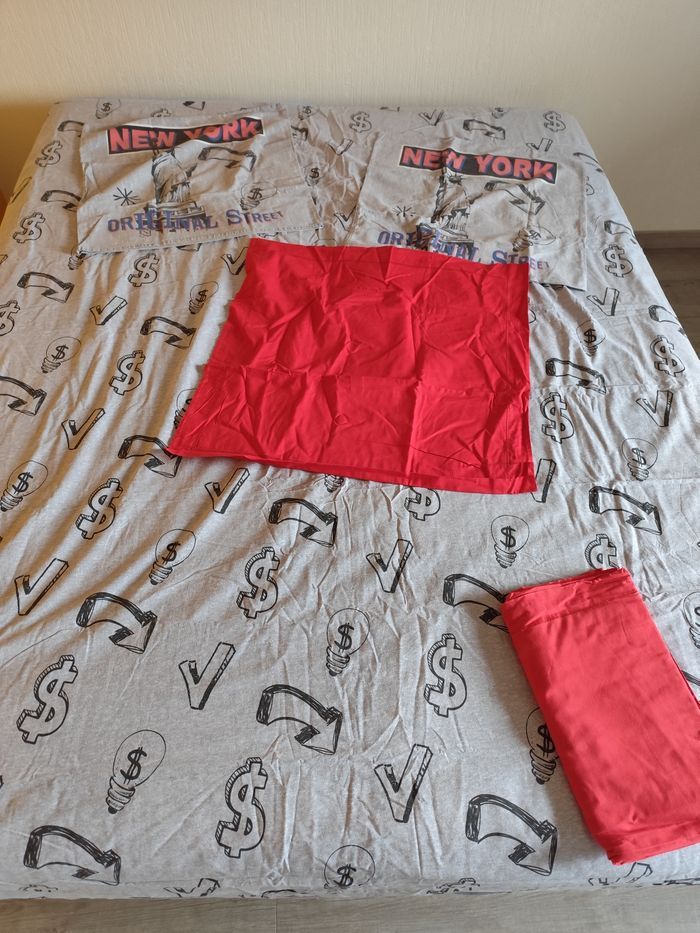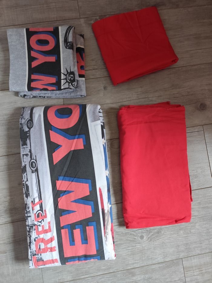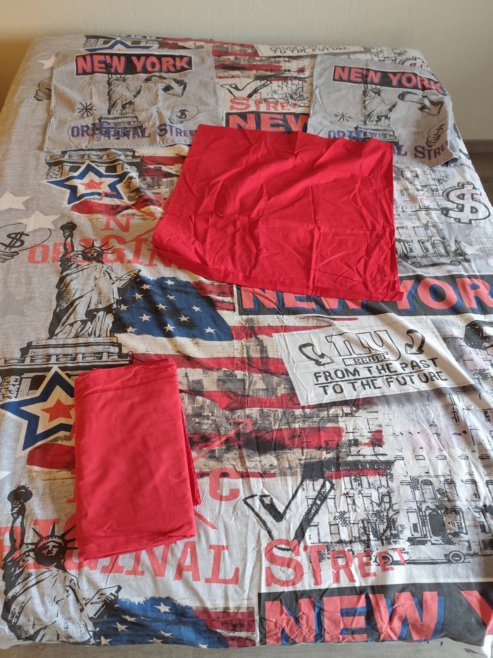 Vend cet ensemble comprenant une housse de couette 200x200, 2 taies 63x63 imprimées et 1 taie unie, et 1 drap 180x290 Très bon état propre Remise en main propre ou frais de port a charge de l'acheteur