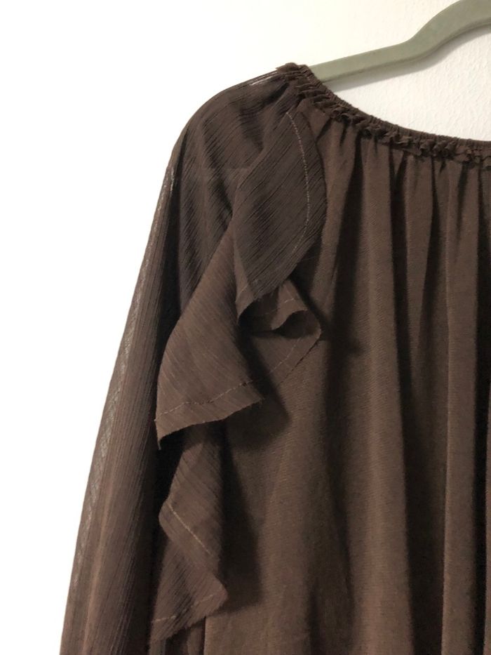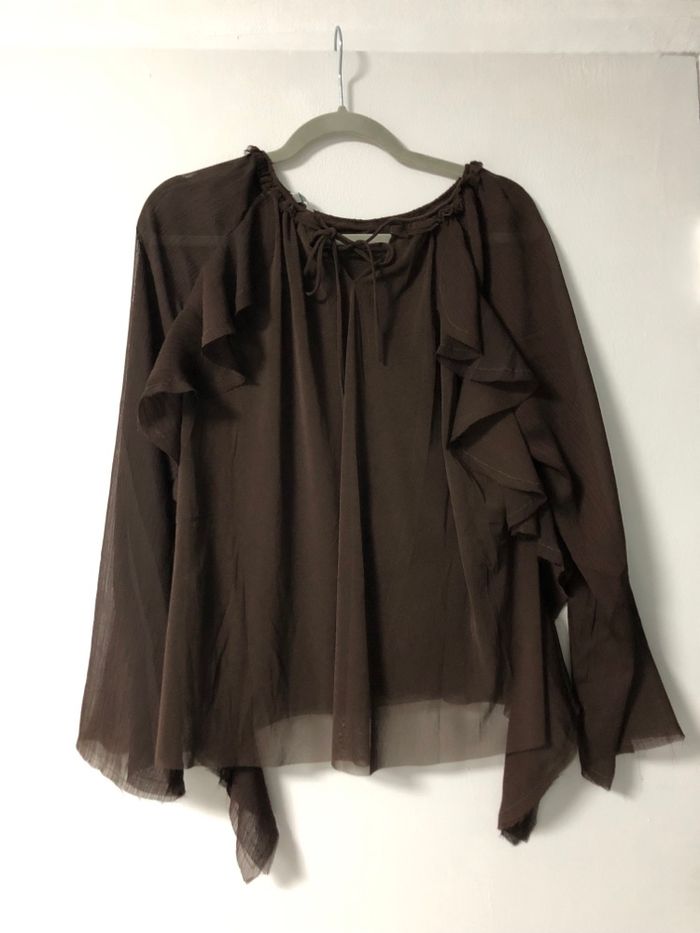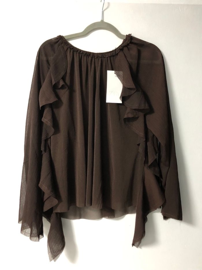 Bonjour je vends une superbe belle blouse fluide à volants couleur marron / chocolat de la marque Zara. C’est une taille M Elle est neuve avec étiquette. La matière est confortable et fluide Super belle portée Blouse fluide à volants très classe Col rond Manches longues Détail de volants dans le même tissu Fermeture arrière par fente et liens . Très légère Je précise qu’elle est transparente Parfaite pour les beaux jours à venir. Les soirées / sorties ou encore bureau accompagné d’un blazer Été plage La blouse est ultra tendance et s’accorde facilement avec tout jean / jupe / short . Pantalon baskets / sandales , bottes etc … N’hésitez pas à consulter mes autres annonces en ligne