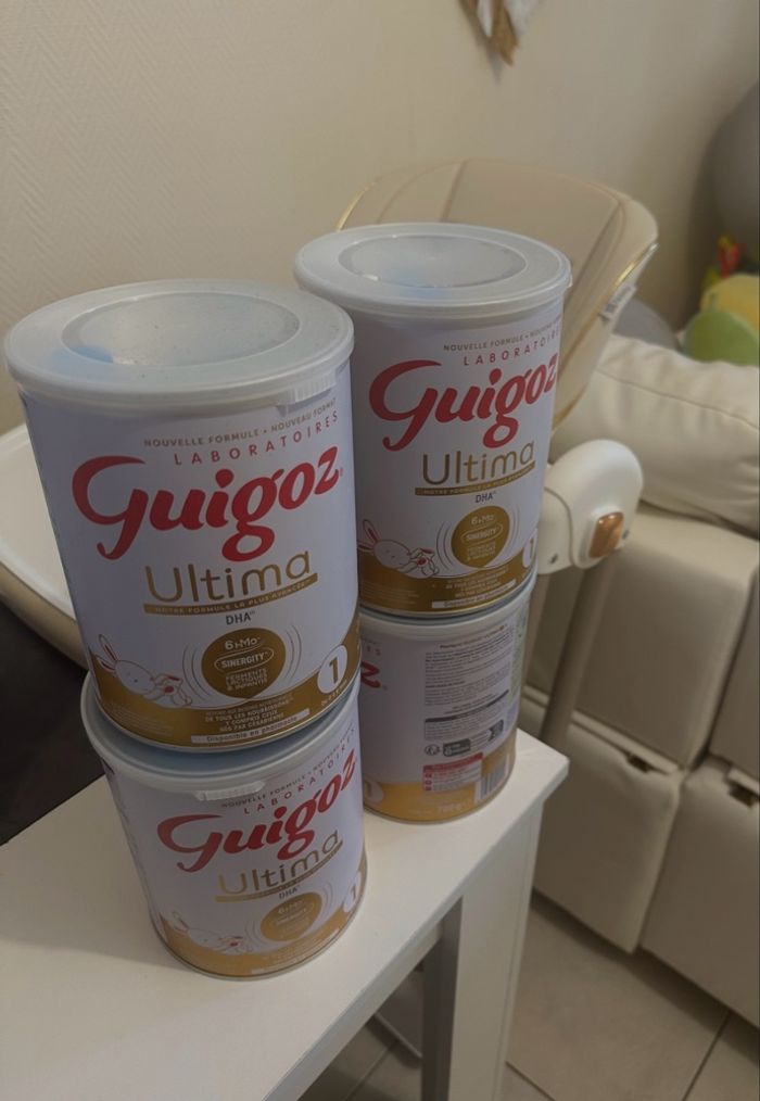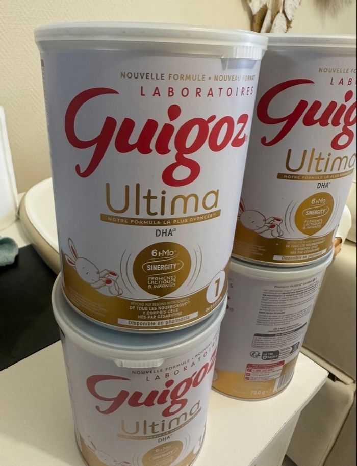 Bonjour, Je vends un lot de 4 boîtes de lait Guigoz Ultima 1 (800g). Ma fille a développé une allergie au lactose, donc nous avons dû changer de lait immédiatement. Etat : Les boîtes sont neuves, scellées et jamais ouvertes. Conservation parfaite. Prix : 40€ pour les 4 boîtes (soit seulement 10€ la boîte !). Je ne suis pas pharmacienne, je souhaite simplement que ce stock profite à un autre bébé à petit prix plutôt que de le gaspiller.