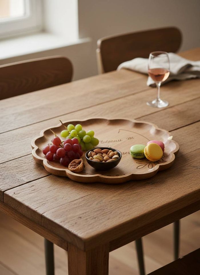 PERSONNALISATION : Le texte central est 100% personnalisable (prénoms, message, date, citation). Gravure laser haute précision réalisée dans notre atelier en France. Me contacter via la messagerie. CARACTÉRISTIQUES TECHNIQUES : Matière : 100% Acacia massif (bois noble, naturellement imputrescible et résistant). Forme : Design festonné "Fleur". Dimensions : Diamètre 33 cm. CONSEILS D'ENTRETIEN : Lavage à la main avec une éponge douce. Ne pas passer au lave-vaisselle ni au micro-ondes. Séchage immédiat pour préserver le veinage du bois. Envoi ultra-rapide et emballage soigné garanti ou remise en main propre secteur Avignon / Orange / Carpentras.
