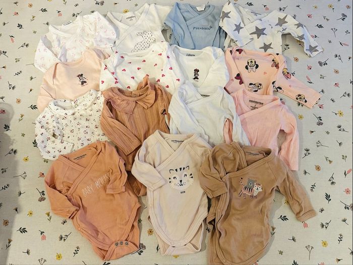 Lot de 15 body manches longues et 6 pyjamas velours. Très bon état. Taille 1 mois.