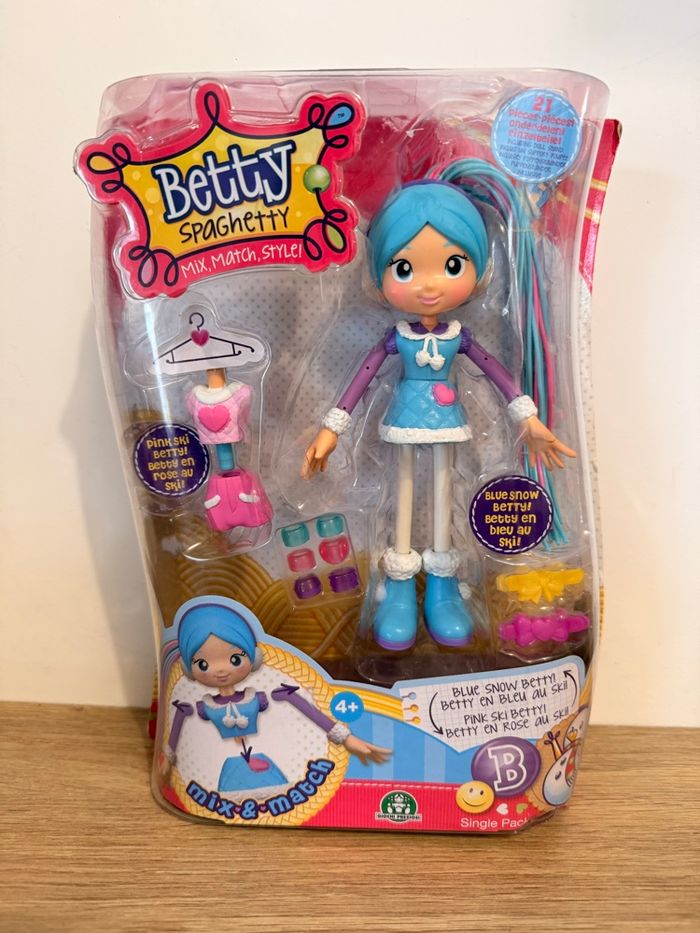 Je vends cette jolie poupée Betty Spaghetty – Blue Snow Betty. ✔️ Neuve, jamais ouverte ✔️ Boîte d’origine intacte ✔️ Version ski (tenue hiver bleue) ✔️ 21 pièces – vêtements et accessoires inclus ✔️ Âge recommandé : 4+ 💎 Modèle devenu introuvable en magasin Idéal pour collectionneur ou pour un cadeau original et vintage. Pièce rare de la gamme Betty Spaghetty, parfaite pour compléter une collection. Envoi rapide et soigné. N’hésitez pas si vous souhaitez d’autres photos 😊 Envoi rapide et soigné. N’hésitez pas à me contacter si vous avez des questions 😊