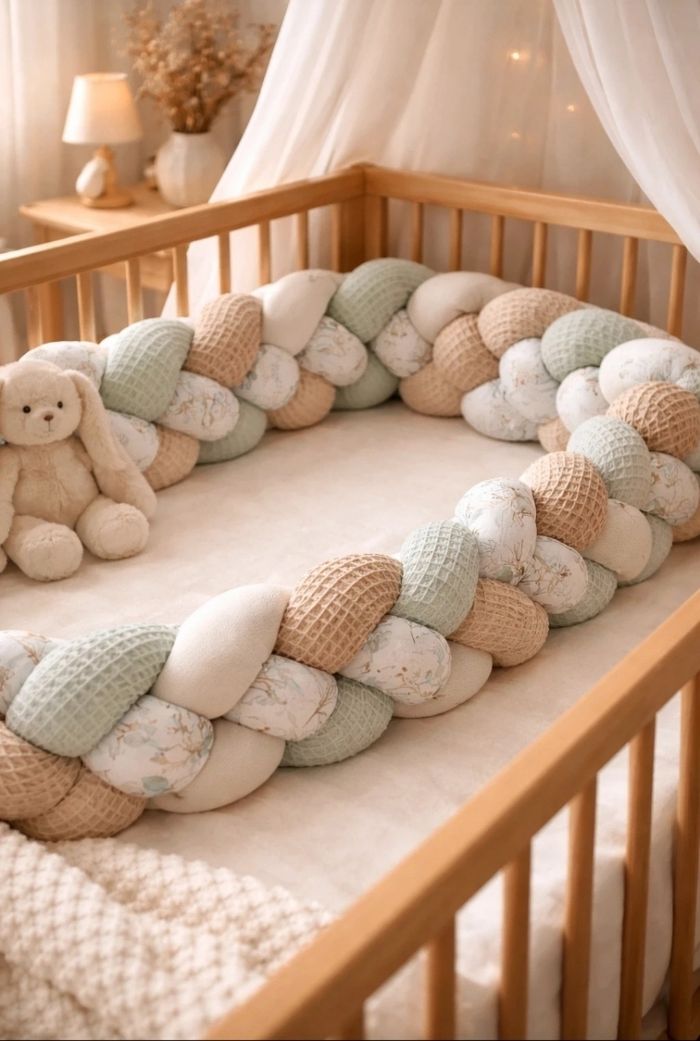 Tresse de lit bébé 4 épis – 4,60 m Thème Jardin Vert Tresse de lit 4 épis de 4,60 m, idéale pour sécuriser et décorer le lit de bébé. Son thème Jardin Vert, aux tons vert sauge, beige et écru, apporte une ambiance douce et naturelle. Création artisanale Au Fil Argenté, réalisée avec des matières en coton douces et confortables. Tressage dense pour un bon maintien et une protection optimale. Neuve Dispo de suite
