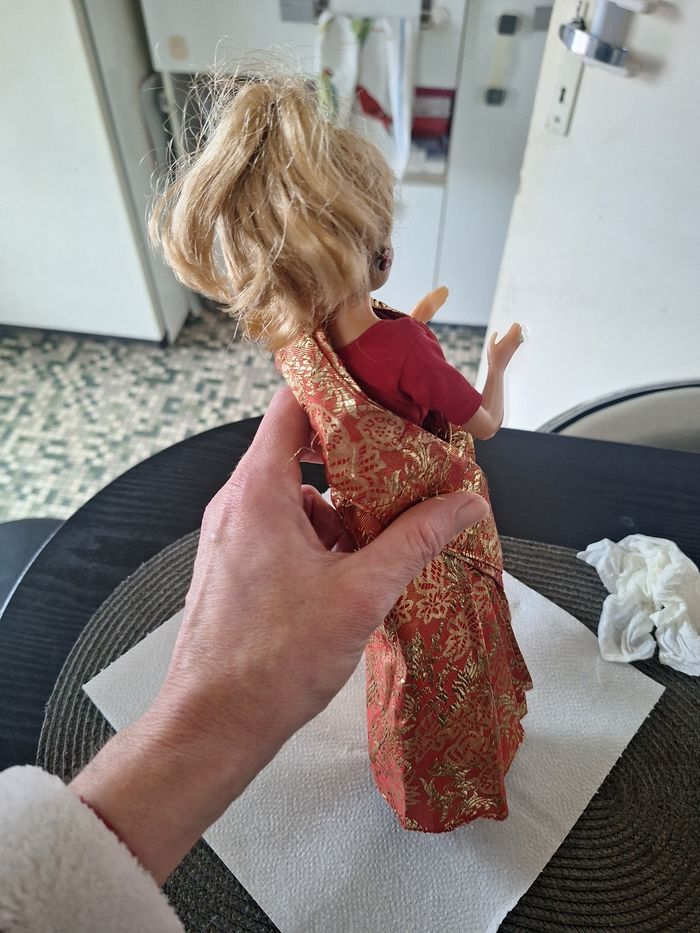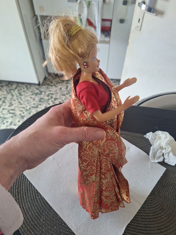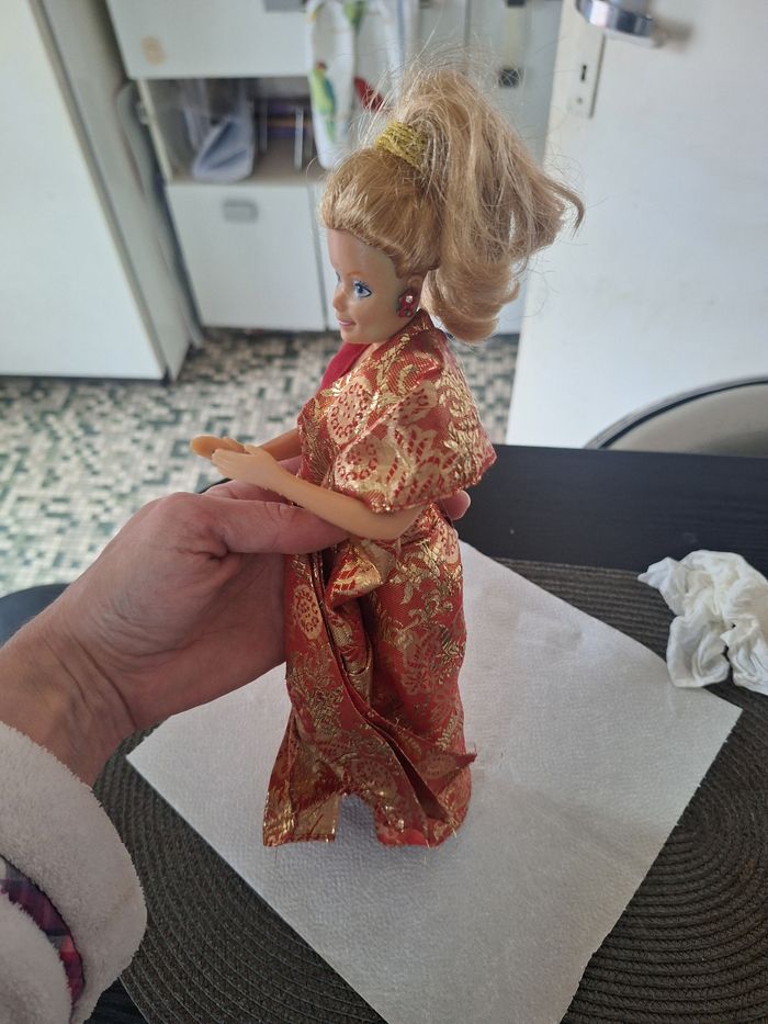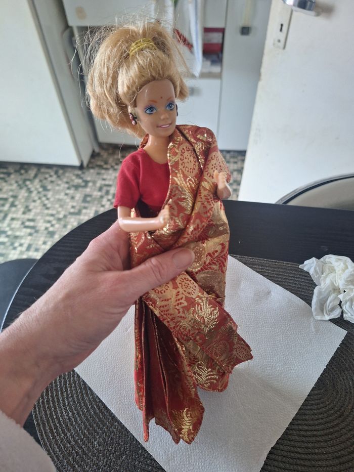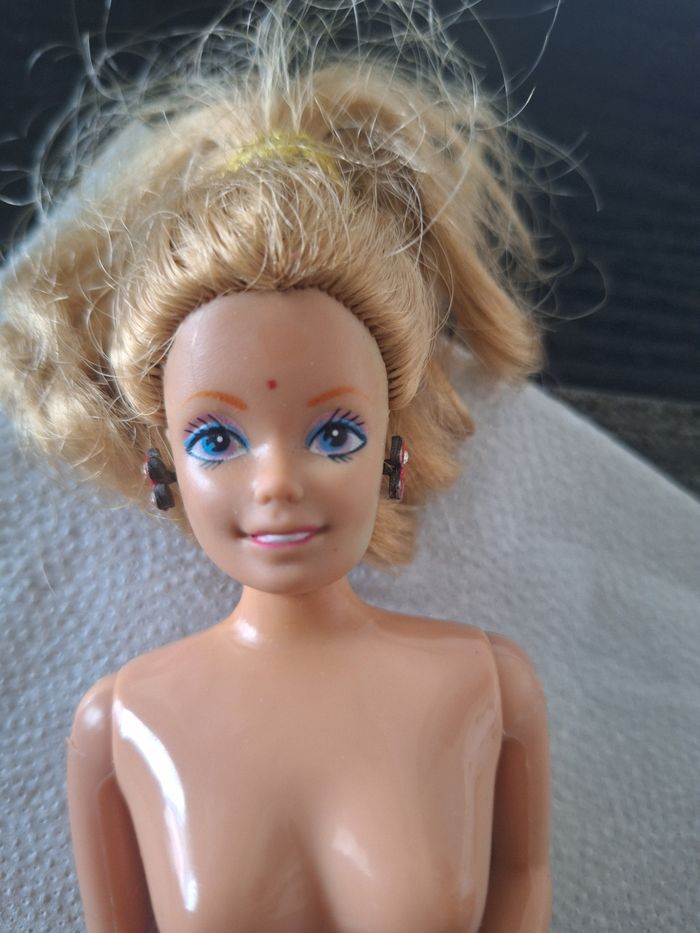 Barbie hindou blonde tres rare de 1987. Vient directement d'inde, m'a été offerte quand j'étais petite. Le corps est en parfait etat, avec tous ses accessoires, maquillage en parfait etat, cheveux en parfait etat, juste l'élastique qui n'est pas d'origine. N'est pas dans sa boîte toute neuve comme le recherchent certains collectionneurs, car elle détient une partie de mon histoire mais j'en ai toujours pris soin.