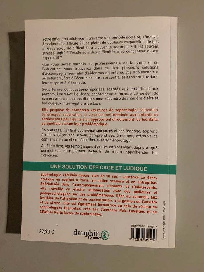 Je vends ce livre "L'instant Sophrologie" de Laurence Le Henry. Faire face au stress et à l’anxiété de votre enfant et votre ado - Titre : L'instant Sophrologie - Auteur : Laurence Le Henry - Genre : Autre - Éditeur : Dauphin Éditions Très bon état N'hésitez pas à me contacter pour plus d'informations !