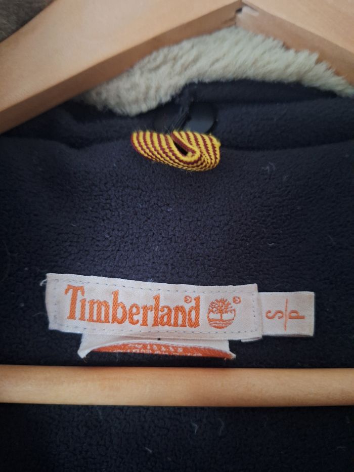 Manteau chaud timberland taille s. Extérieur imperméable et matelassé. Intérieur polaire avec rembourrage en plume d'oie. De nombreuses poches, fermeture zippé ou boutons. Fourrure du col polaire détachable par boutons. Capuche avec visière qui se rabat. Très bonne qualité, durable