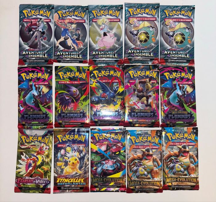Lot de 15 Booster Pokémon reconditionnés et rescellés. Toutes collections depuis écarlate et violet jusqu’à flammes fantasmagorique mélangés dans les boosters. 2 reverse et 1 holographique minimum par booster. Quelques Hit possible 😉 #pokemon #pokemoncards #pokemontcg 3€/booster (Envoyé un message prix négociable pour des lots)