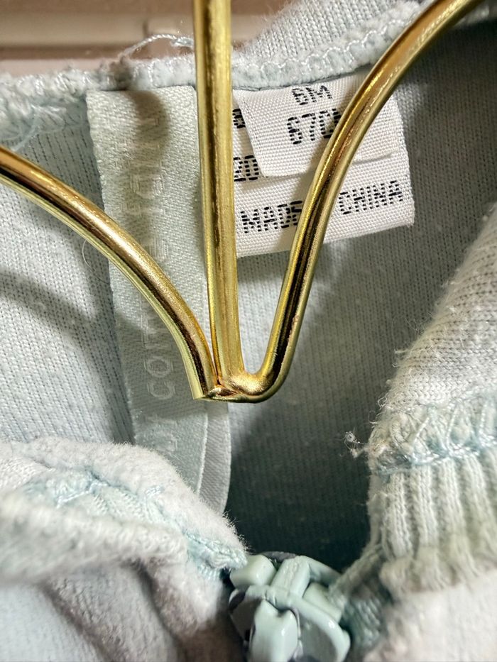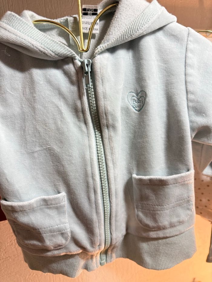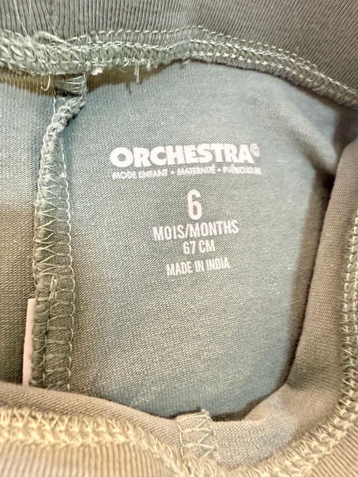 Adorable ensemble bébé tout doux 💚 Comprend : • Legging vert sauge orchestra • T-shirt manches longues blanc à petits motifs kimbaloo • Gilet zippé en velours avec poche tout compte fait Matière confortable et agréable à porter. Parfait pour la mi-saison 🌸 Taille 6 mois Très bon état