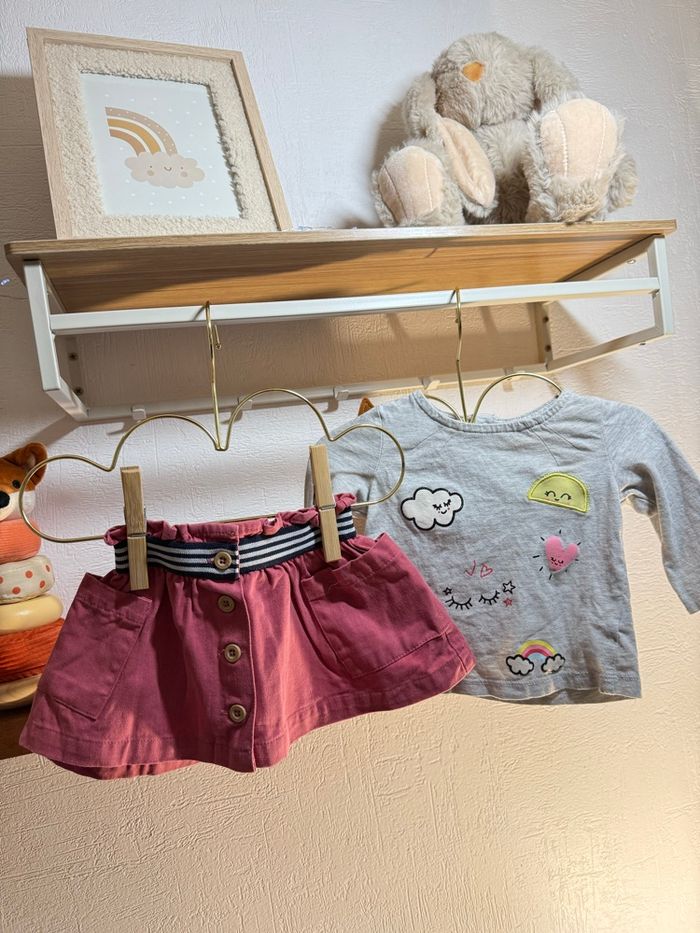 Tenue trop craquante et originale 🌸 • Jupe rose avec boutons et poches vertbaudet • T-shirt gris manches longues avec motifs nuages, arc-en-ciel et petit cœur Look doux et girly parfait pour le printemps/été☀️ Super mignon avec collants ou petites baskets🩷 Taille 6 mois Très bon état