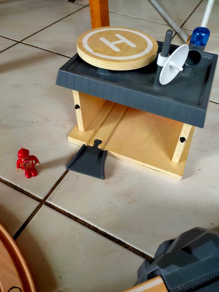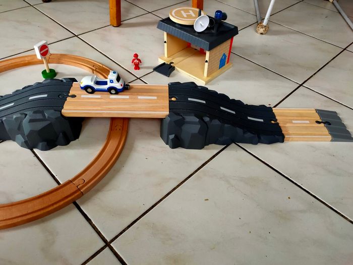 Set de rails et route en bois avec centre d'intervention qui fait le son des sirènes des véhicules d'urgences. Il manque une façade de la maison. L'ensemble est en très bon état.