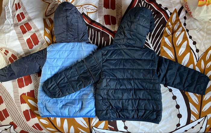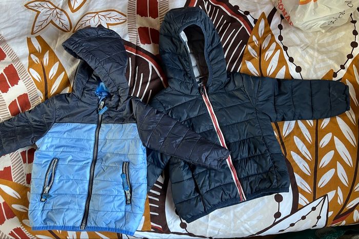 Deux doudounes légères à capuche pour enfant, l'une bleu clair et l'autre bleu foncé, en bon état général. Marque Verbaudet et Obaïdi. ⭐️ État : 8/10 🎲 Taille : 86cm, 2 ans. 📦 Livraison rapide et soignée.