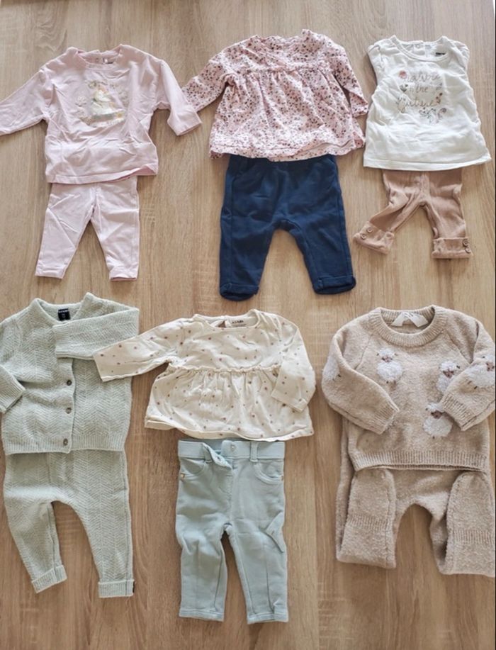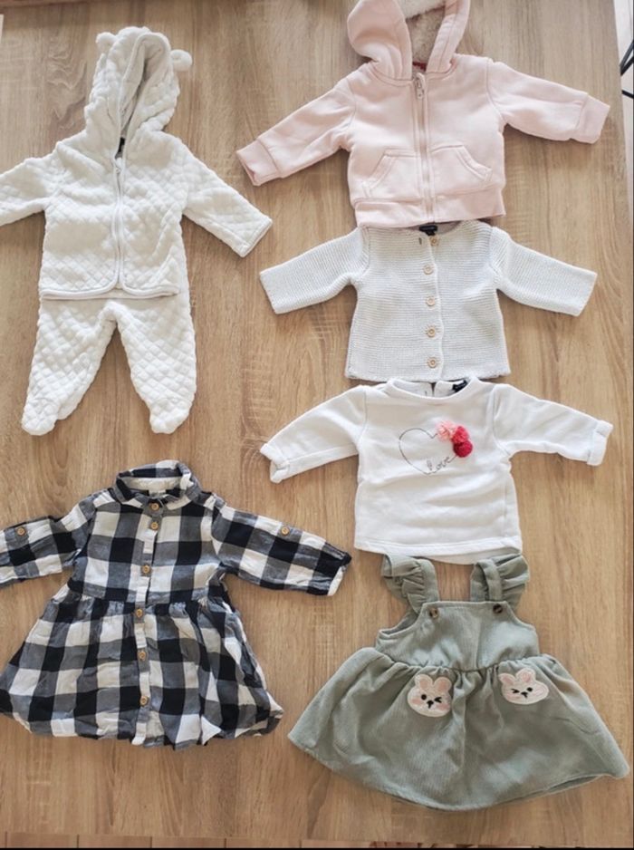 Bonjour voici un lot comprenant divers vêtements pour bébé fille taille 3mois Ce lot contient : - 7 bodies manche longue dont 3 de marque Disney. - 7 ensembles de marque kiabi/ orchestra/ tape à l'œil / kimbaloo et primark. - 1 pull de marque kiabi - 1 gilet de marque tissaia - 2 robes dont une de marque kiabi Le tout est en très bon état, sans tache, sans trou. Maison non fumeur.