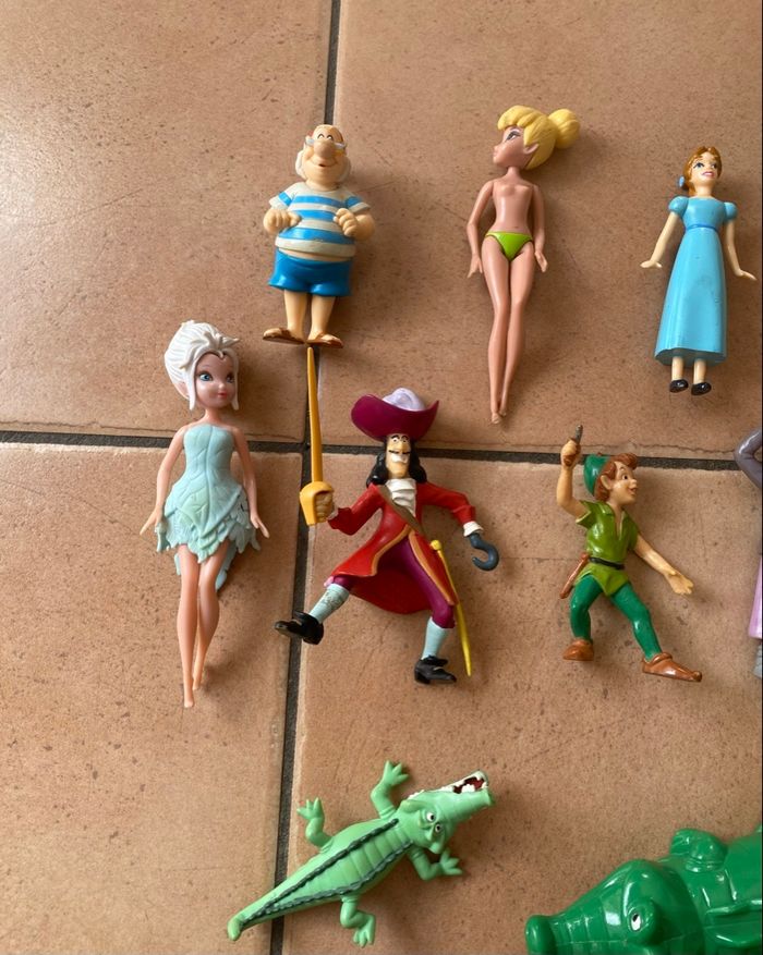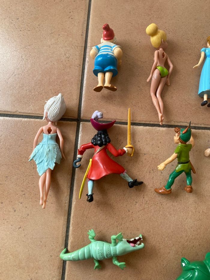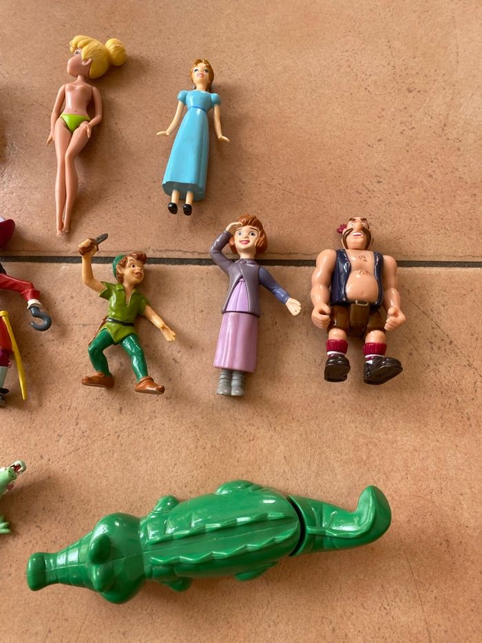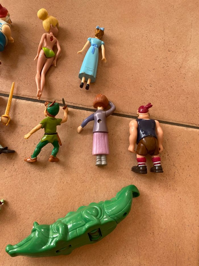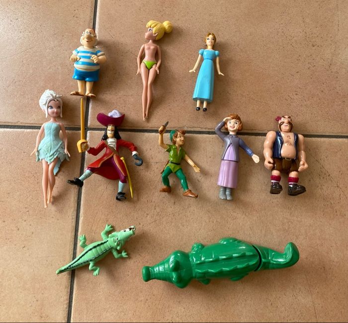 Lot de 10 figurines du dessin animé Peter Pan : - Capitaine Crochet : Bullyland - Pirate des garçons perdus : disney - Mouche : Disney - Peter Pan : Bullyland - Wendy : Disney - Jane : McDo 2002 - petit crocodile : Bullyland - gros crocodile : disney - fée clochette : Jakks - fée pervenche : Jakks Il manque les ailes aux deux fées Vous achetez ce que vous voyez sur les photos