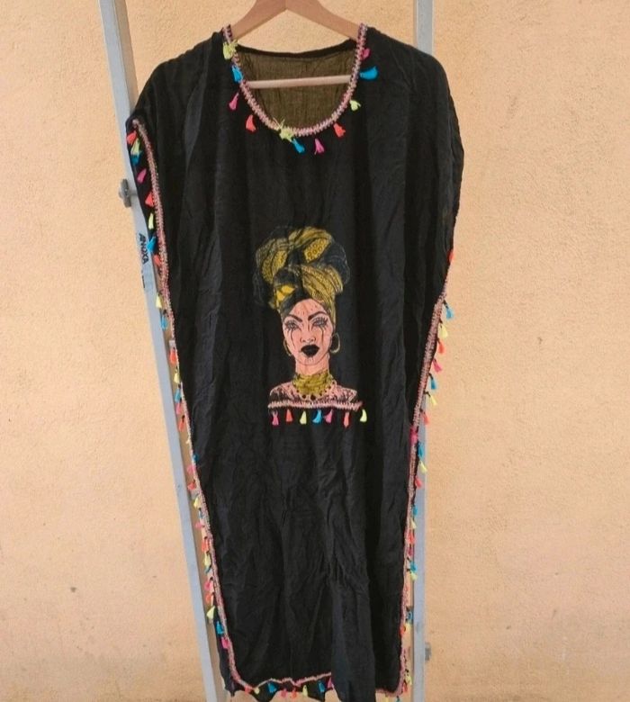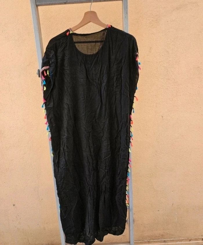 Abaya robe noir sans manche avec froufrou multicolore et imprimer Taille unique pouvant aller du S ( tres oversize/fluide) au L (assez près du corps) Très bon état Aucun defaut Prix négociable Remise en main propre possible