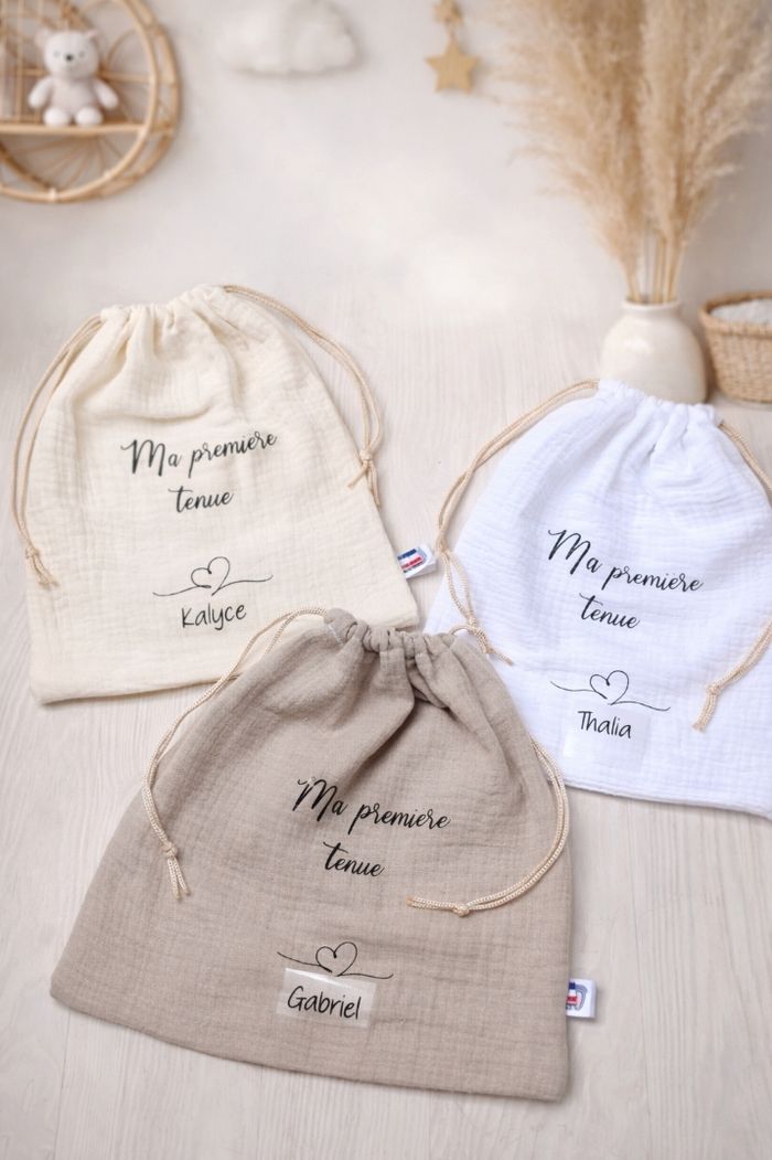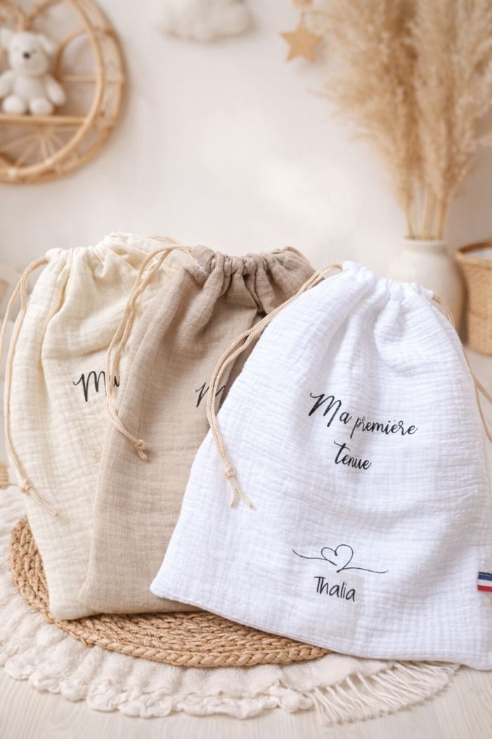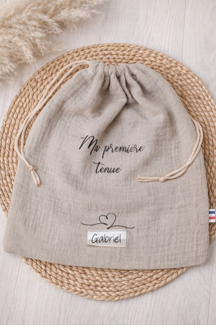 Pochon de naissance personnalisé 25x30 cm 3 coloris au choix ( blanc, ecru, beige )
