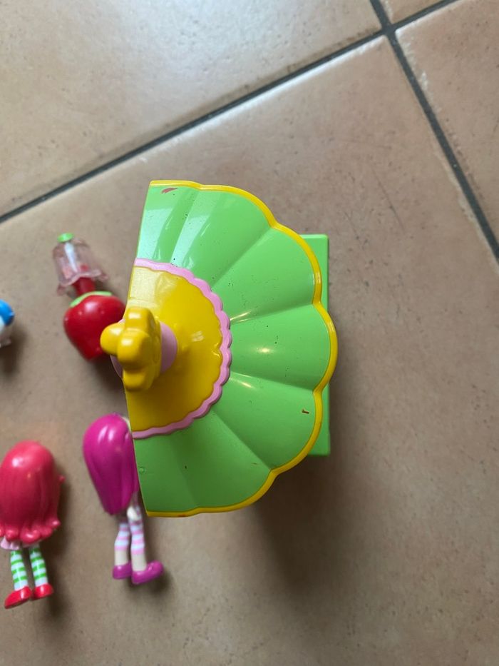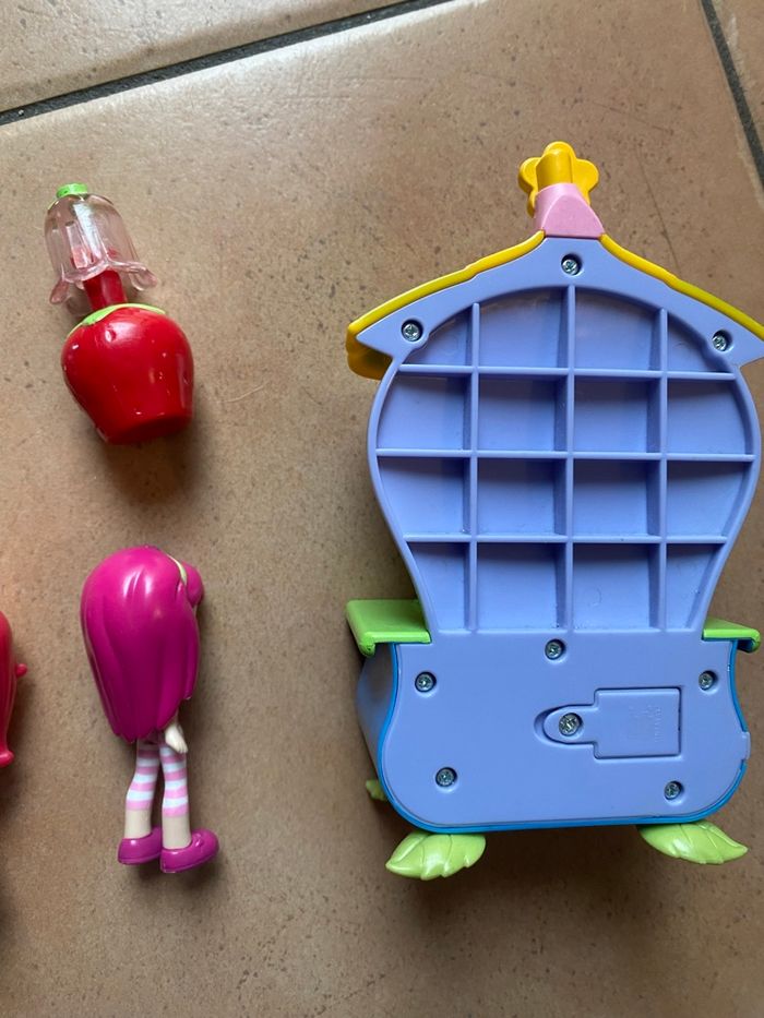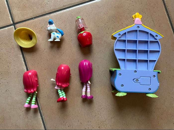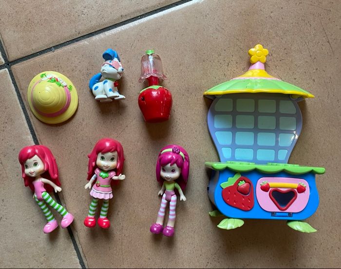 Lot de Charlotte aux fraises : - La cuisinière - 3 figurines dont une avec chapeau (traces de stylo à l’intérieur de celui-ci) - un chien - une lampe Je ne sais pas si les éléments fonctionnent Date de 2004 à 2008 Vous achetez ce que vous voyez sur les photos