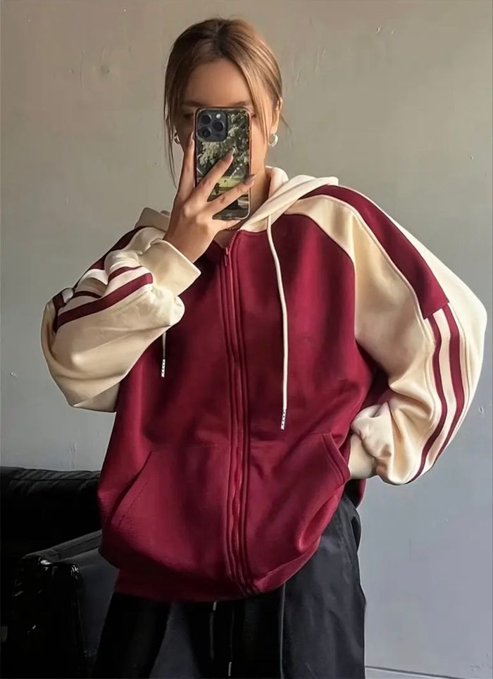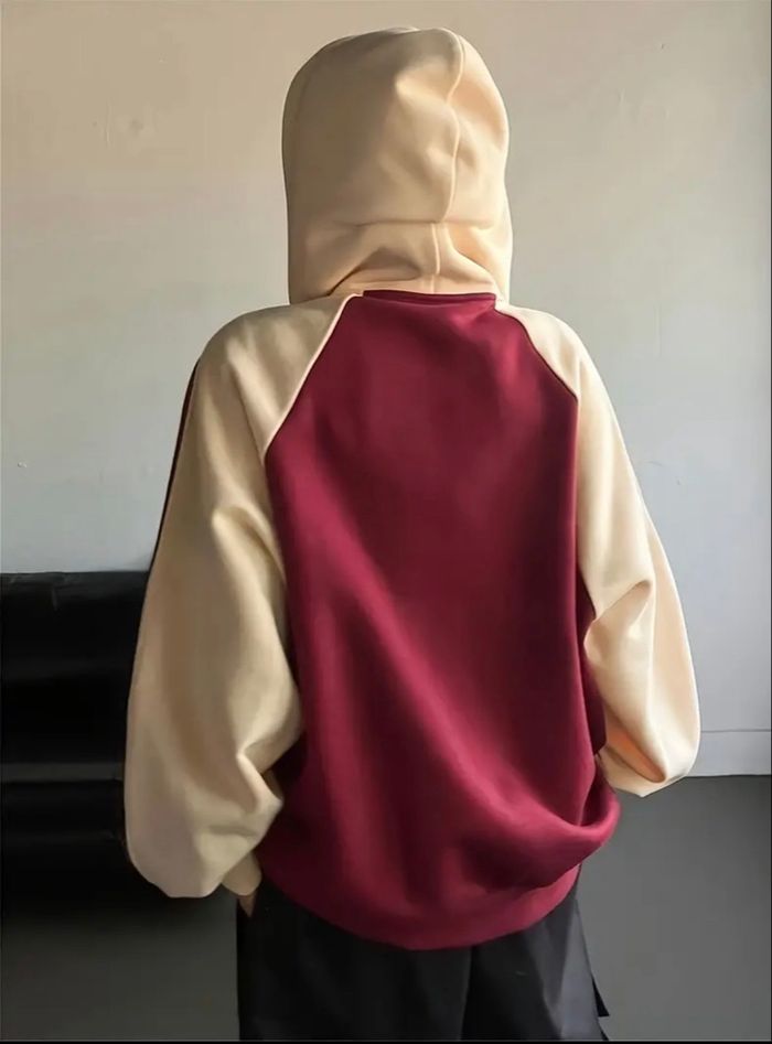 Sweat Hoodie Zippé Oversized Bordeaux & Beige – Style Vintage Campus – Taille M