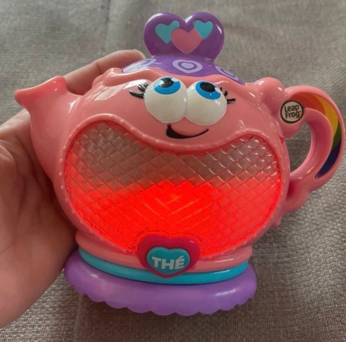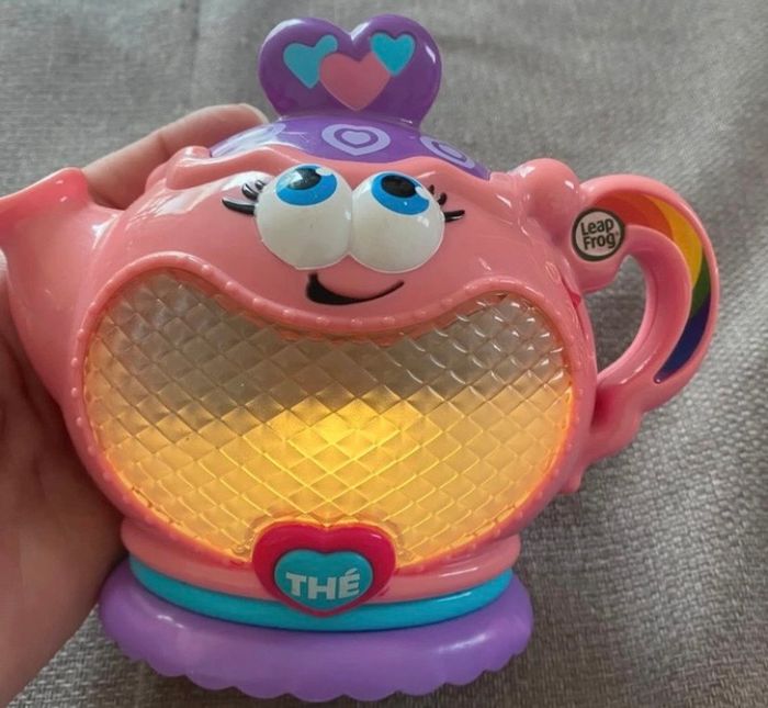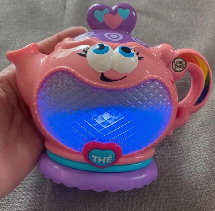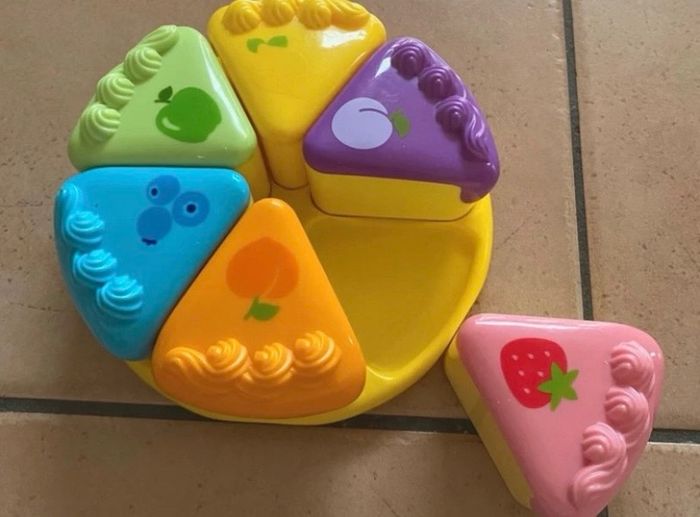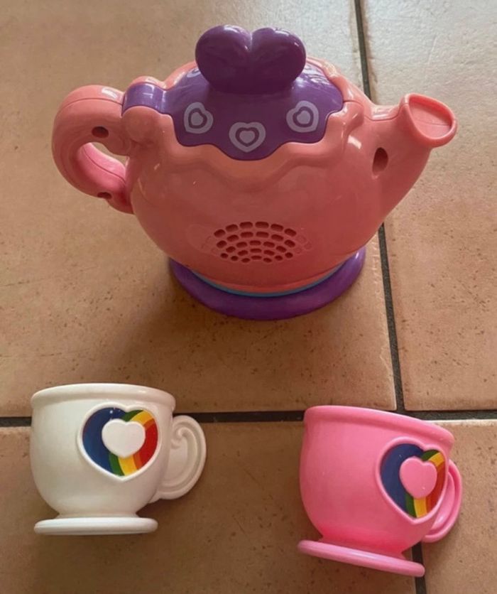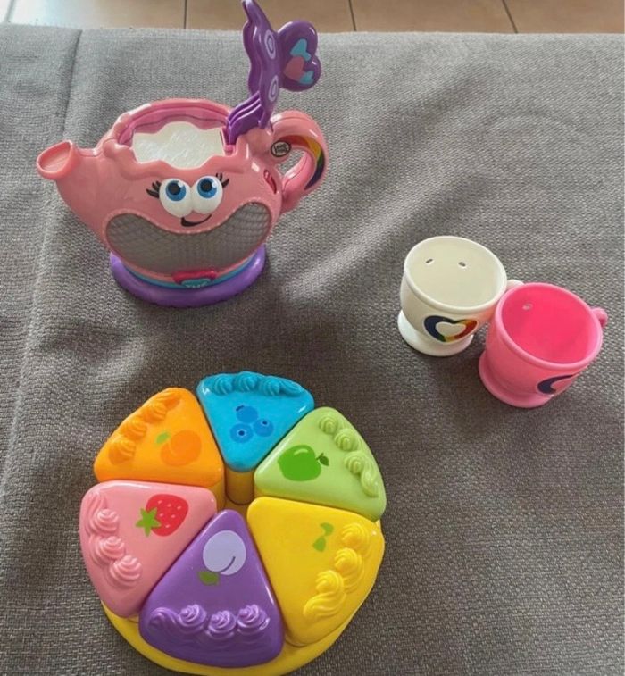 Set de jeux avec une théière musicale qui fait de la musique, différentes couleurs…deux tasses et un gâteau coupé en six part de fruits différents Jeu à partir de 12 mois Fonctionne très bien Vendu sans pile Vous achetez ce que vous voyez sur les photos