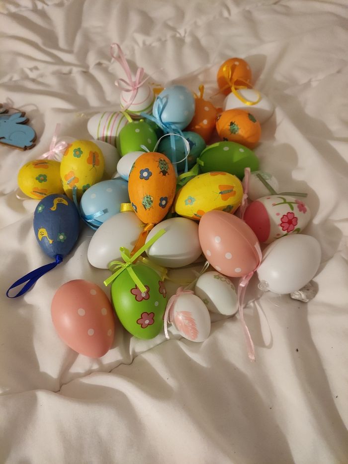 1 lot de déco de Pâques avec oeufs en plastique de plusieurs couleurs et ou décorés 3 lapins a suspendre en bois Une douzaine de poules a suspendre aussi et un panier et ou nid