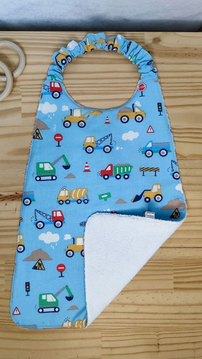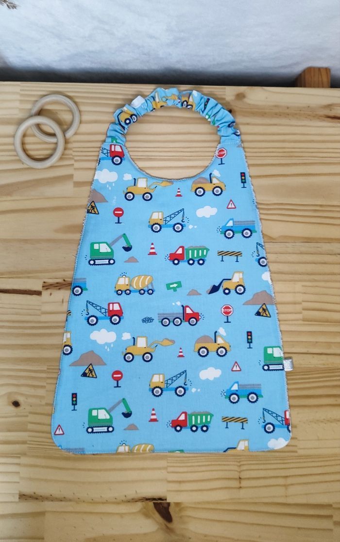 Grand bavoir élastique travaux ✨ Idéale pour la crèche, la cantine, ou à la maison ! 📏 Dimensions : 38 cm depuis l'épaule, 34 cm depuis l’encolure x 30 cm au plus large. 👕 Taille : 18 mois/6 ans ✨ Coton oekotex + éponge blanche absorbante. ✅ Facile à enfiler grâce à l’encolure élastique 🧵 Confection soignée, belle qualité 📬 Envoi rapide et soigné #bavoirelastique #bavoircantinematernelle