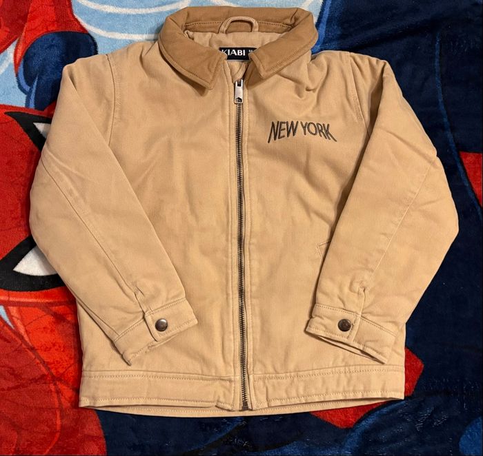 Veste beige avec écriture “NEW YORK” devant et derrière. Très bon état – Kiabi Taille : 8 ans (128 cm)