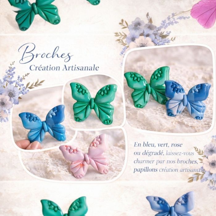 Laissez-vous séduire par nos broches papillon en pâte polymère, entièrement façonnées à la main avec soin et passion. Chaque pièce est une création artisanale unique, modelée et travaillée avec délicatesse afin de révéler des reliefs subtils et un effet légèrement brillant qui capte la lumière. Disponibles en plusieurs coloris (bleu, vert, rose ou en dégradé), ces broches apportent une touche d’élégance et de poésie à vos tenues. Légères et agréables à porter, elles subliment aussi bien une veste, un manteau, un pull  Chaque papillon est réalisé en petite série, ce qui garantit l’authenticité et le charme du fait main. Une création délicate, idéale pour offrir ou pour se faire plaisir avec un accessoire original et raffiné. Matériel pâte polymère  Forme papillon  Couleurs bleu, rose, vert bleu et rose.. Dimension hauteur 3,5 cm  largeur 4 cm à approximatif Vernis résine UV recto-verso  Offert petite chaîne  Vendu à l'unité