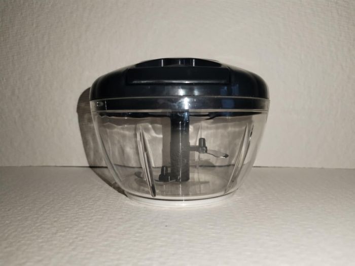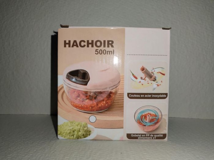 Hachoir manuel de cuisine (type "hachoir à ficelle") d'une capacité de 500ml. Idéal pour hacher rapidement de l'ail, des oignons, des herbes, des noix ou préparer des petites sauces (pesto, guacamole, houmous). État : Neuf (jamais utilisé, vendu avec sa boîte d'origine). Matériaux : Lames en acier inoxydable et bol en plastique PP de qualité alimentaire. Utilisation : Très simple, il suffit de tirer sur la poignée. Pas besoin d'électricité Entretien : Se démonte entièrement pour un nettoyage facile. Parfait pour gagner du temps en cuisine sans s'encombrer d'un robot électrique imposant.