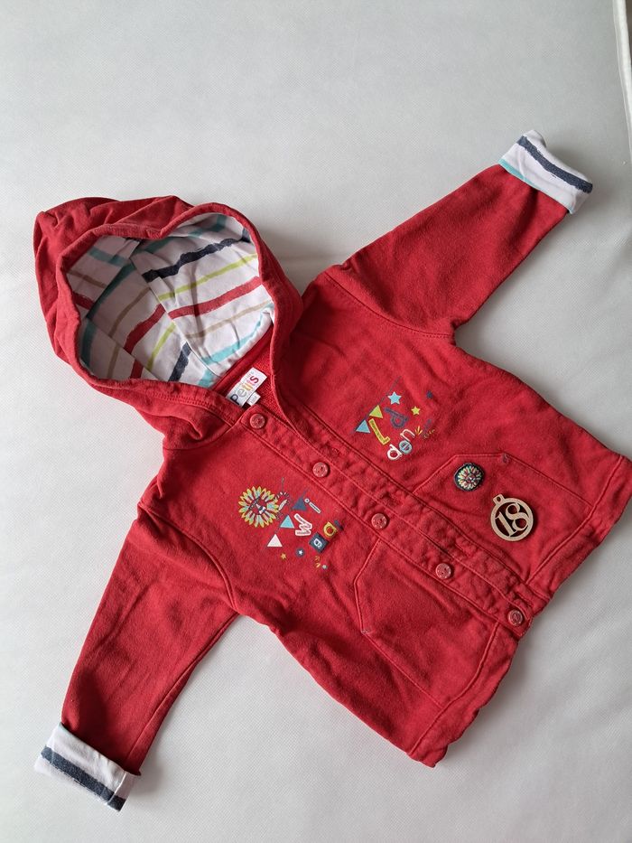 Composée de : 1 gilet à capuche matière sweat fermeture par bouton. 1 Tee-shirt manche longue fermeture par pression derrière. 1 pantalon doublé réglable à la taille par élastique et bouton. 1 paires de chaussette taille 21/22 gratuite L'ensemble et en très bonne état général Taille 18mois Marque la compagnie des petits