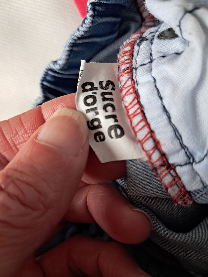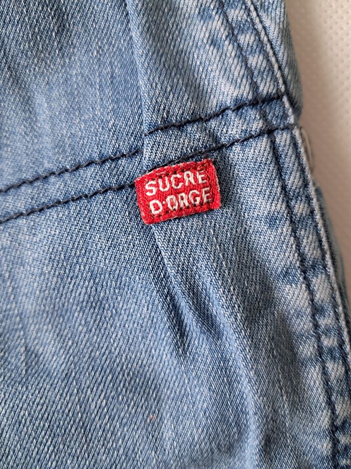 Bonne état général Petite trace légère d'usure en bas à l'arrière du jeans mes pas troué voir photo. Jeans taille élastique Taille 24mois étiquette coupé Marque Sucre d'orge