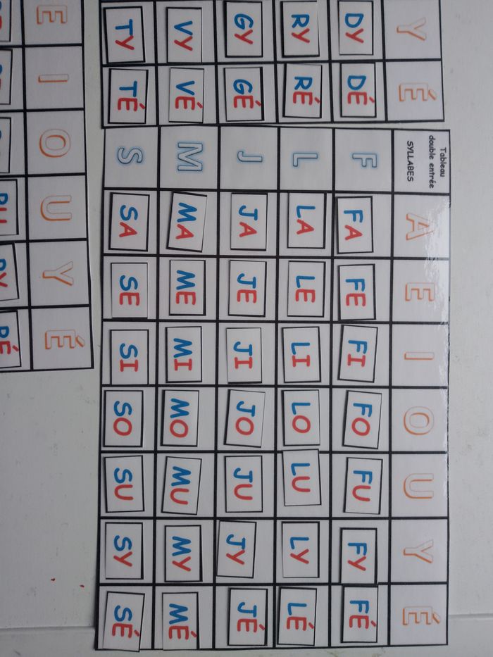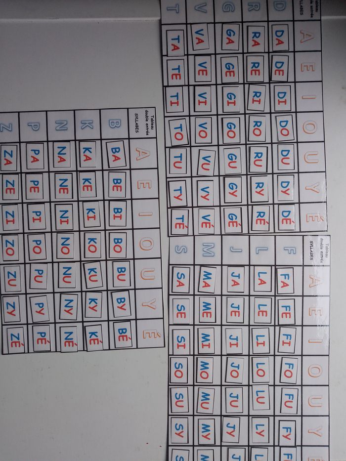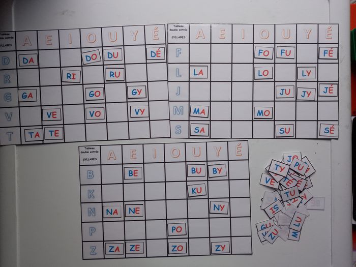 jeu éducatif pour enfant pour travailler la lecture / la fluence = le décodage de syllabes simples écrites en majuscules script (code couleur rouge pour les voyelles / bleu pour les consonnes ) : place les syllabes dans les tableaux à double entrée / puis ensuite lis les / pour s'entrainer à lire le plus rapidement des syllabes / lecture chrono avec chronomètre / atelier autonome lecture français