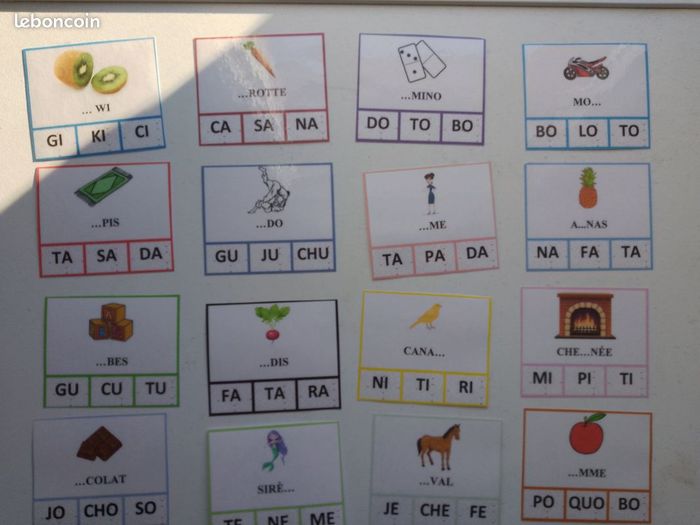 jeu éducatif pour enfant / jeu de lecture : lot comprenant 24 cartes à pince pour travailler la lecture / décodage et encodage / l'enfant doit retrouver la syllabe manquante du mont en plaçant la pince, jeton, trombone sur la bonne syllabe / atelier autonome lecture français / montessori maternelle CP cartes plastifiées