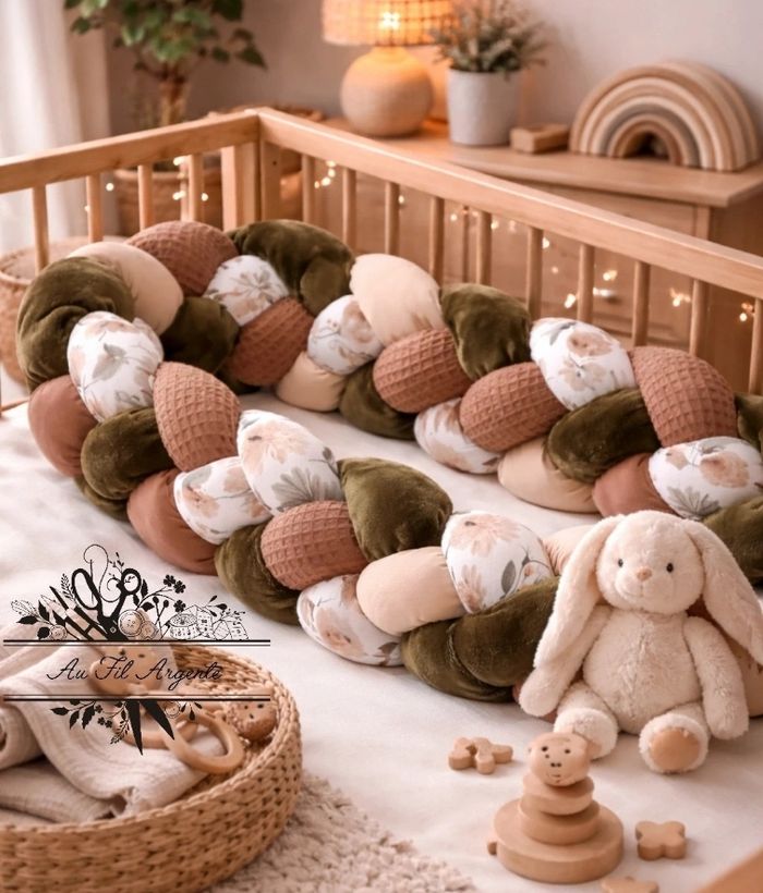 ✨ **Tresse de lit fine – 4 épis** ✨ Apportez une touche chaleureuse et élégante à la chambre de bébé avec cette tresse de lit fine réalisée en 4 épis. Ses tons naturels mêlant vert profond, beige doux, marron et imprimé floral délicat créent une ambiance apaisante et tendance. Chaque détail a été pensé pour offrir un rendu harmonieux et raffiné. 📏 **Longueur :** 3 mètres 📐 **Hauteur :** environ 15 cm 🆕 **État :** neuve 💎 **Modèle unique – ne sera pas reproduit** by Au Fil Argenté 💰 **Tarif : 85 €** Parfaite pour sécuriser le lit tout en sublimant la décoration, elle s’adapte facilement aux lits standards grâce à sa belle longueur. Une pièce exclusive pour une chambre qui ne ressemble à aucune autre. Disponible immédiatement.