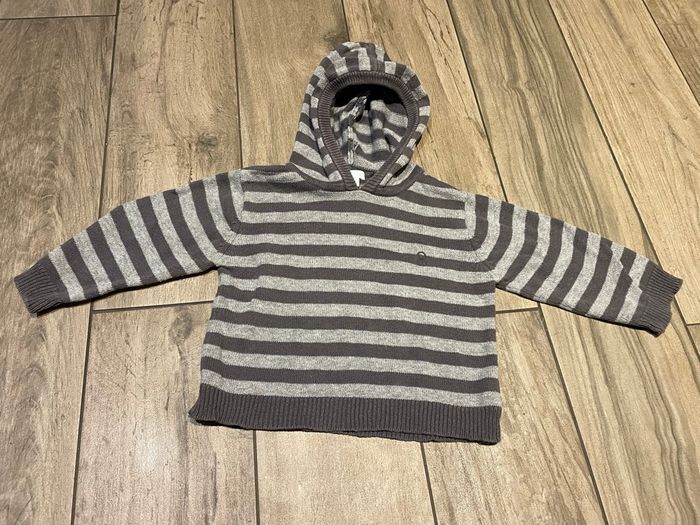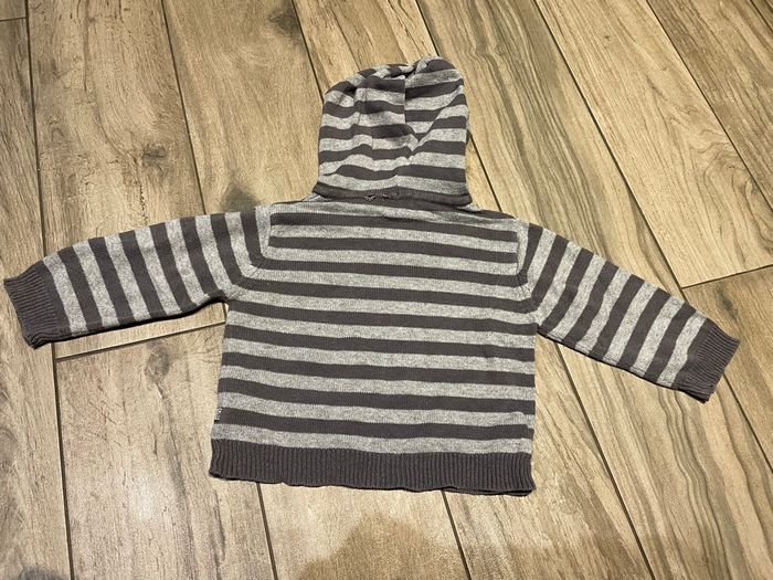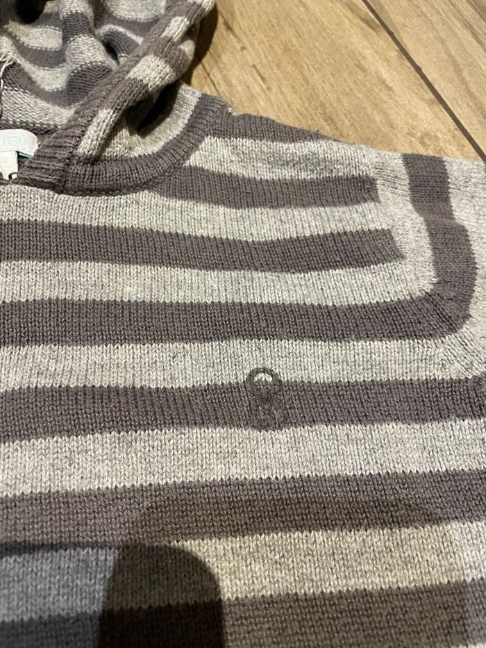 Taille 12 mois. Un petit trou derrière la capuche, ne se voit pas une fois porté. A part cela pas de défaut.