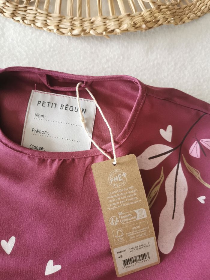 🧑 Tablier déperlant 🧑 Petit Béguin 🖊️ ÉTAT ✅️: Parfait 👌 Avec étiquette 🏷️ Jamais porté 🆕 🖊️ DESCRIPTION: ▪️Taille 4/5 Ans - 104/110 cm ▪️Matière: 100% polyester ▪️Tissu déperlant ☔ ▪️Col rond ▪️Manches longues elastiquées au poignet ▪️Ouverture facile par boutons pression 🔘🔘🔘 à l'avant ▪️Étiquette 🏷️ intérieure pour écrire 🖊️ nom et prénom ▪️Imprimé chien 🐕 🌸🌸🌸 ▪️Couleur: Cassis