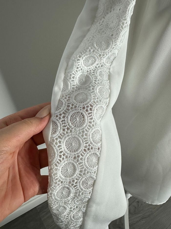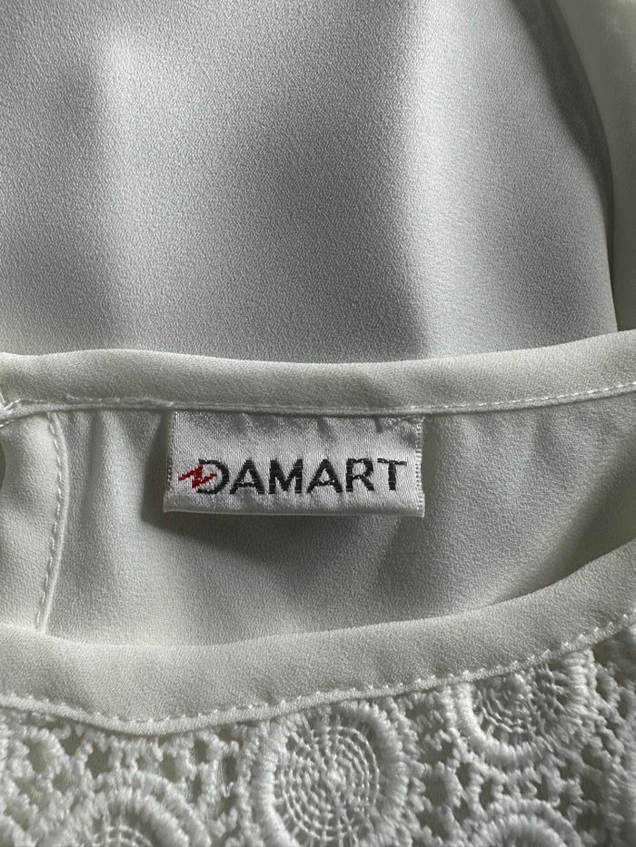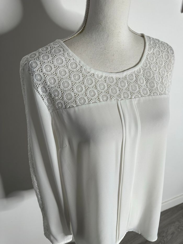 Blouse - Excellent état - Taille 38 équivalent M Dimensions en bas de l’annonce - Couleur blanche - Marque Damart - Manches longues - Dentelle au niveau du haut - Pas d’étiquette de taille ni de matière Dimensions: - 41cm niveau épaules - 54cm niveau aisselles - 63cm de long