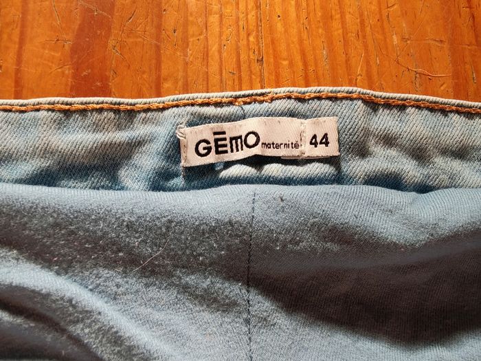 Jean de grossesse bleu, taille 44, marque GEMO. Porté souvent. Avec bandeau pour le ventre. Vendu 25€ neuf.