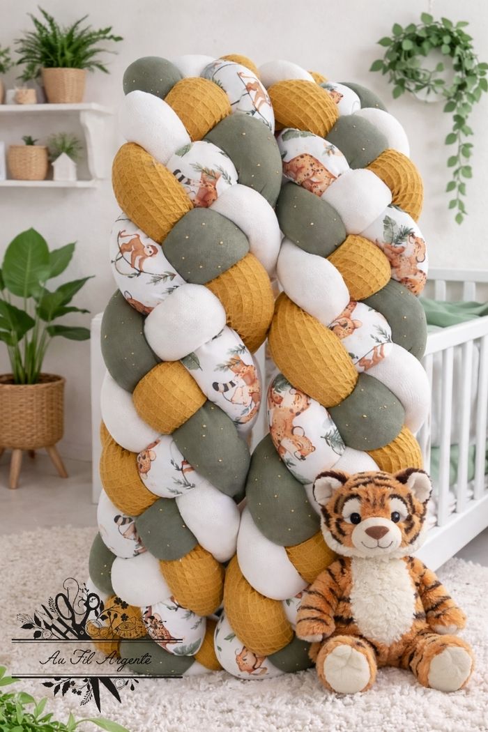 🌿 Tresse de lit fine – 4 épis – 3 mètres 🌿 Superbe tresse de lit artisanale en 4 épis, longueur 3 mètres, hauteur environ 15 cm. Coloris vert sauge, moutarde et blanc avec imprimé jungle, parfait pour une chambre bébé mixte ou thème nature. ✨ Modèle unique – ne sera pas reproduit Création artisanale Au Fil Argenté. Idéale pour sécuriser le lit tout en apportant une touche chaleureuse et tendance à la décoration. 🧵 Fait main avec soin 📏 Longueur : 3 m 📐 Hauteur : environ 15 cm 💰 Prix neuf : 85 € 🎉 Actuellement en promotion -10 % Envoi rapide et soigné. N’hésitez pas si vous avez des questions.