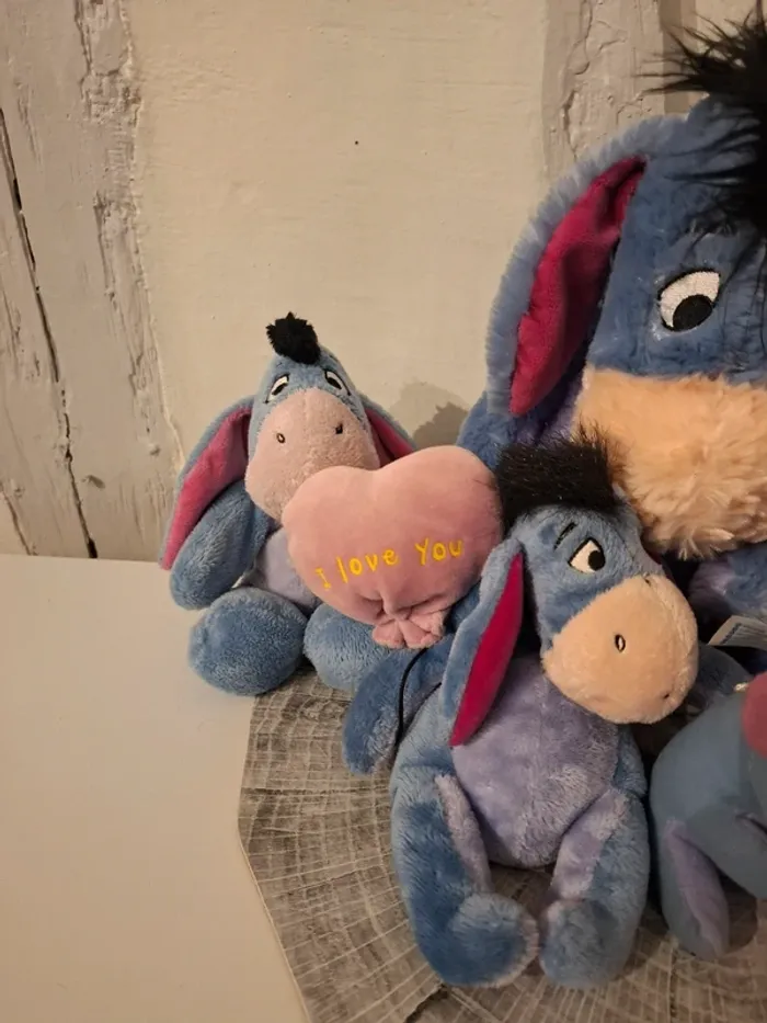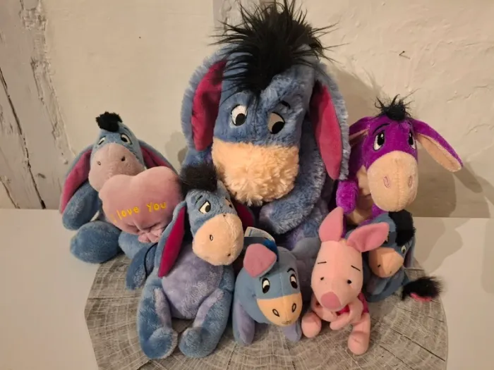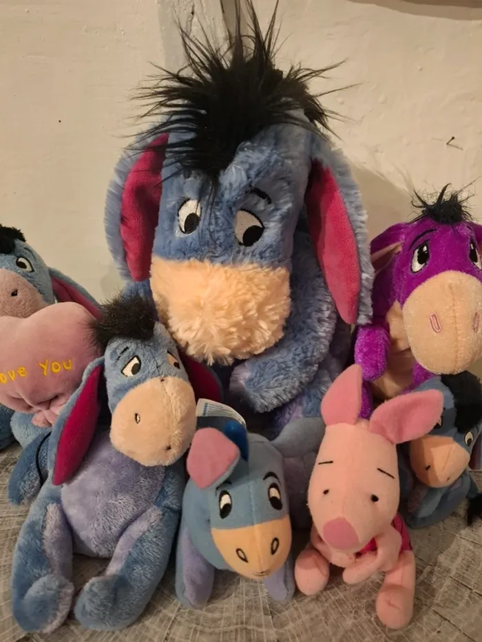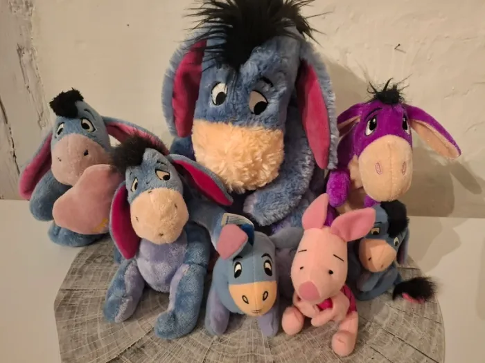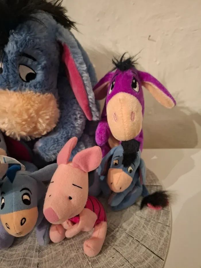 Lot de peluches de Bourriquet personnage de l'univers Disney de Winnie l'Ourson.