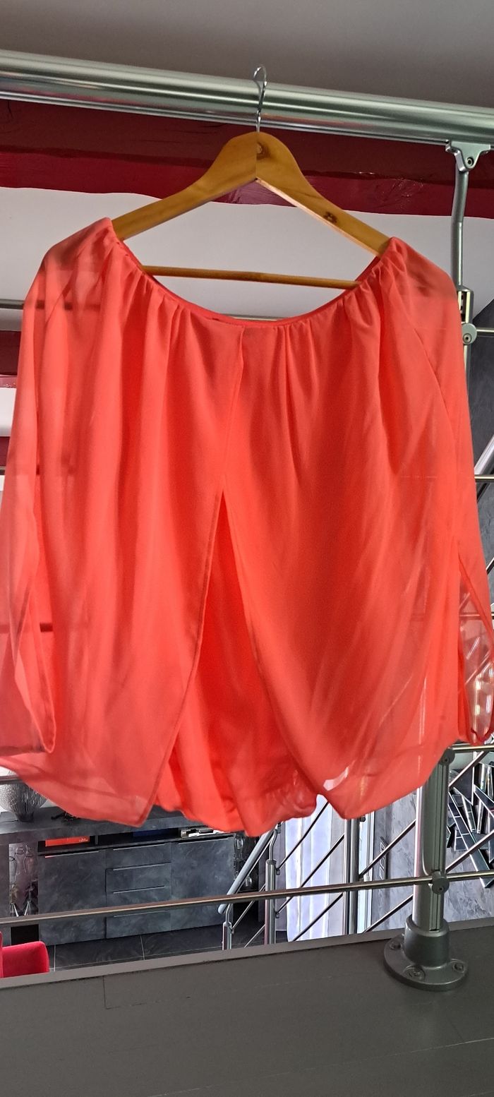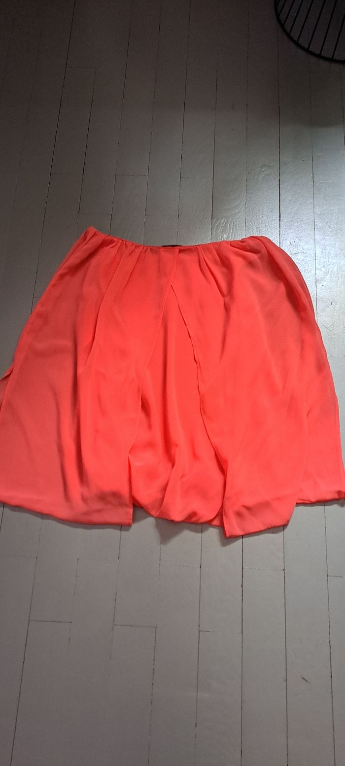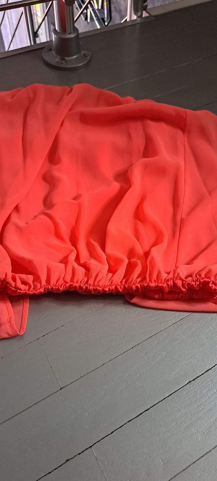 Jolie blouse, en très bon état effet blousant car élastiquée à la taille, manches ouvertes, superposition derrière, originale, la couleur est moins orangée que sur les photos plus corail, elle est doublée sauf aux manches, pas de taille indiquée mais convient du S au M