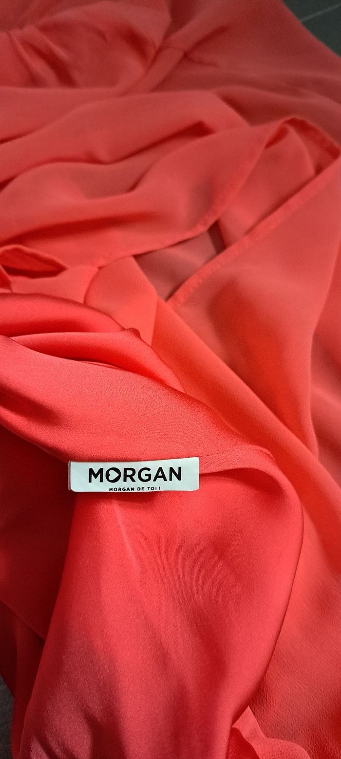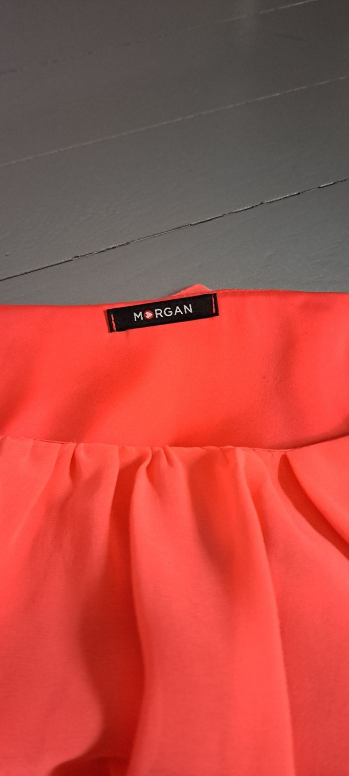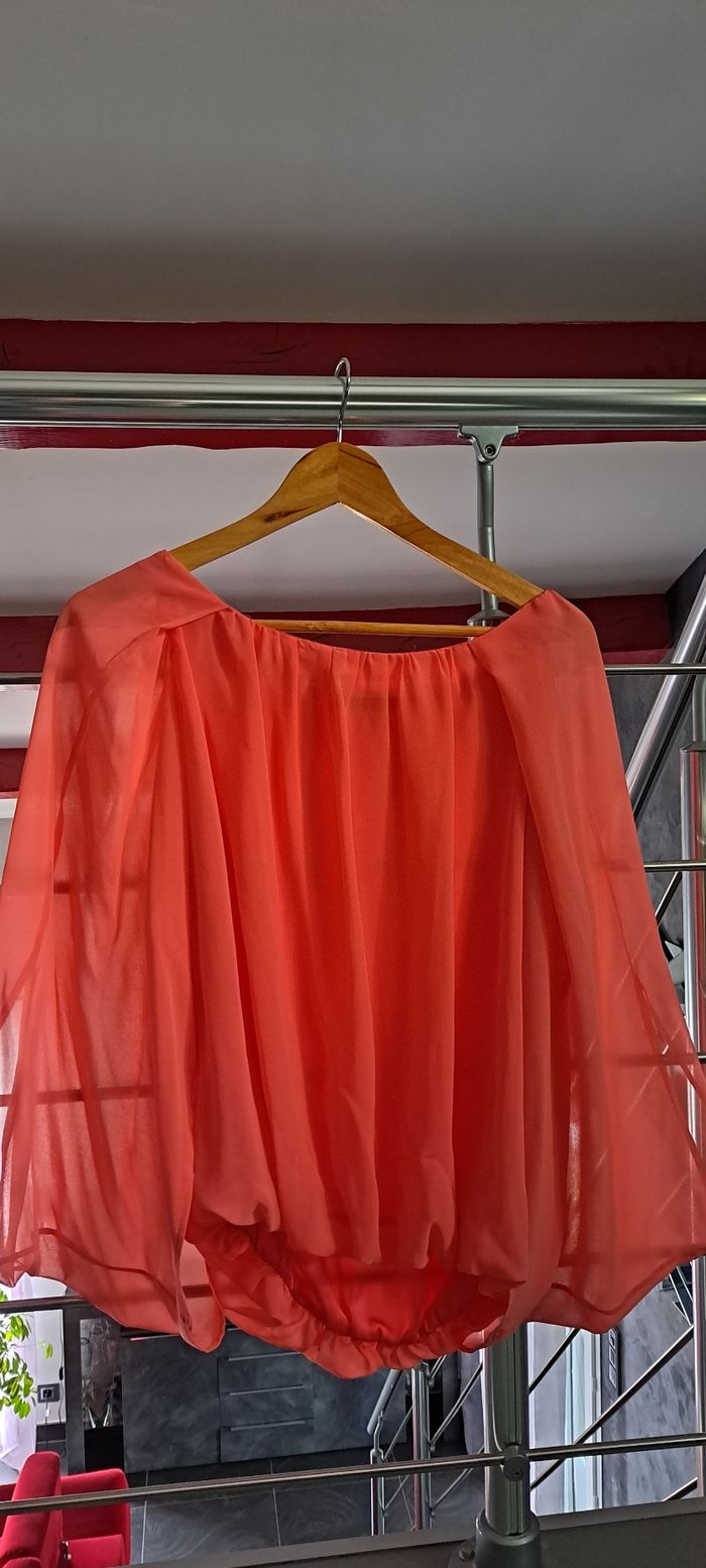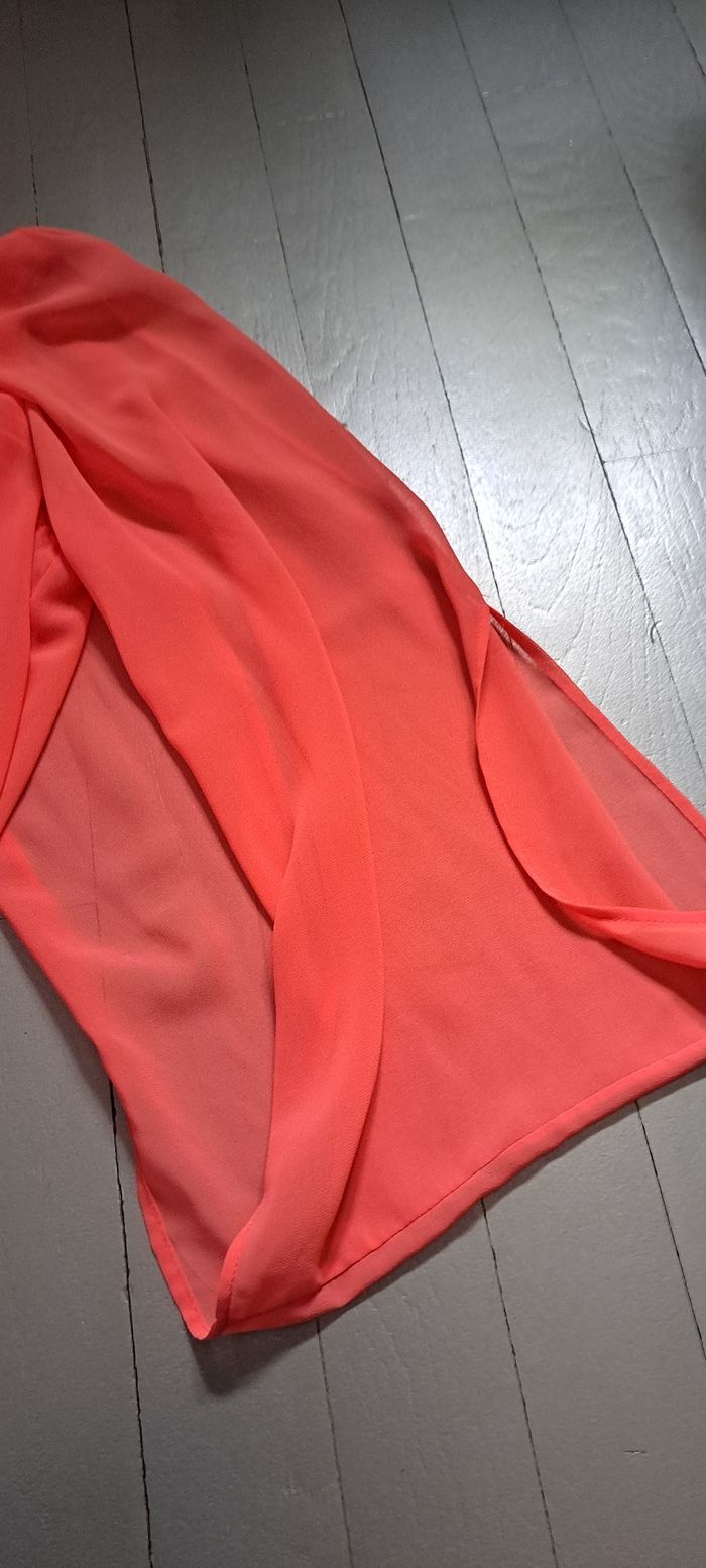 Jolie blouse, en très bon état effet blousant car élastiquée à la taille, manches ouvertes, superposition derrière, originale, la couleur est moins orangée que sur les photos plus corail, elle est doublée sauf aux manches, pas de taille indiquée mais convient du S au M