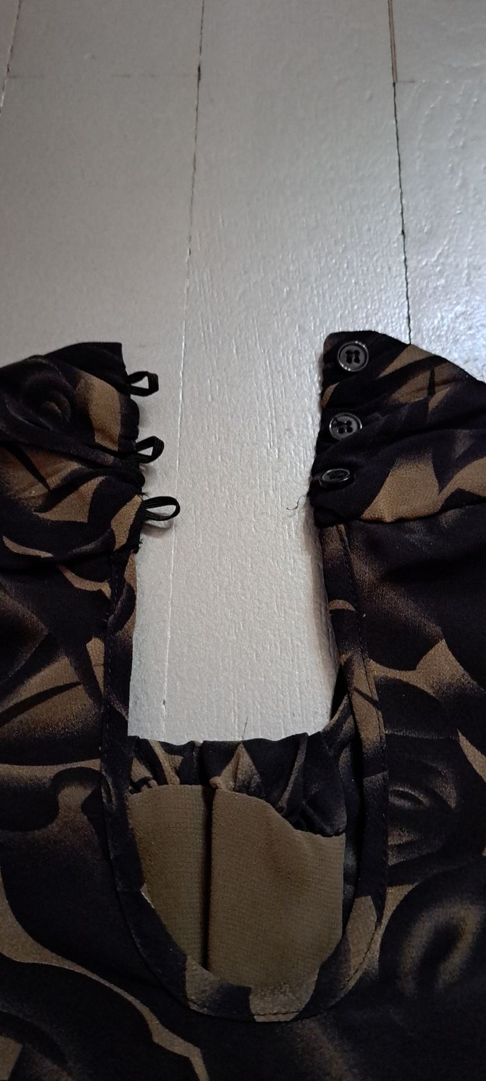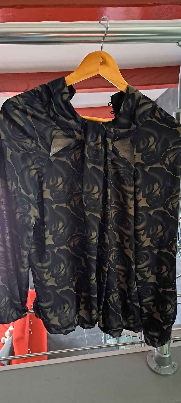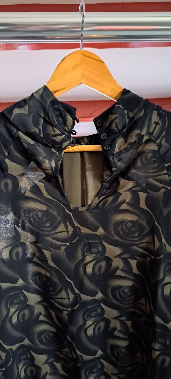 Jolie blouse motifs roses kaki et noire, attache par petits boutons au cou, découpe sur le décolleté devant et élastiquée à la taille, en parfait état, aucun défaut